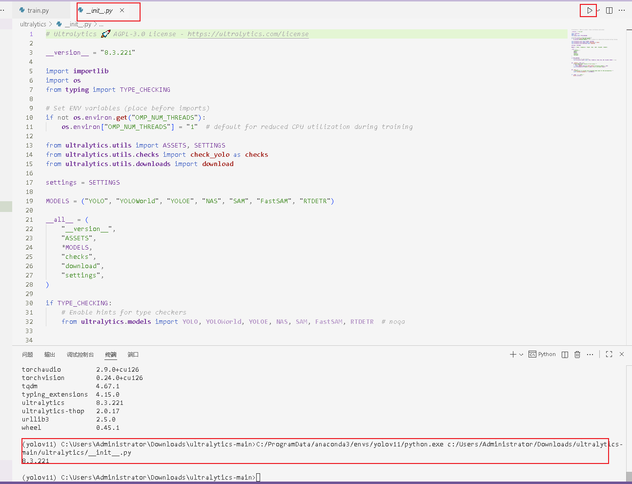 点击运行可以看到已经切换成yolov11的虚拟环境了
