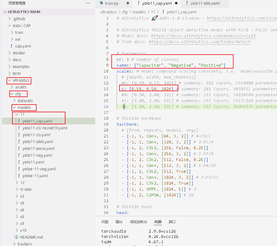 4.复制一份官方的yolo11.yaml改名为yolo11_cap.yaml,并修改下面内容,其他不用修改。