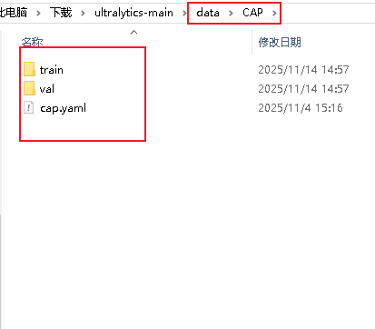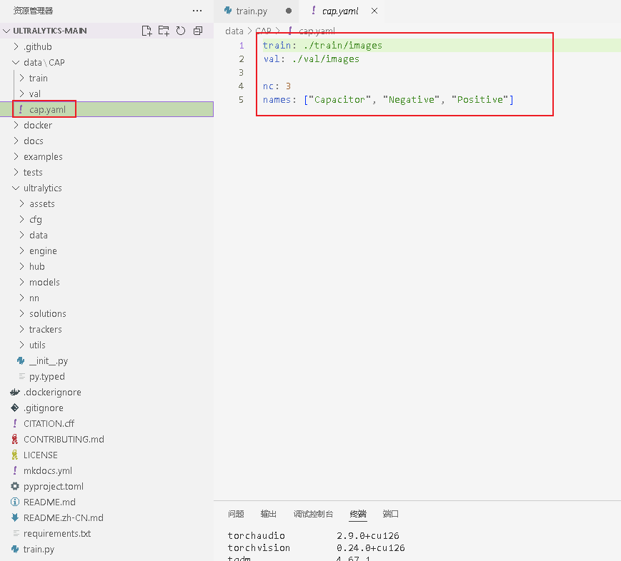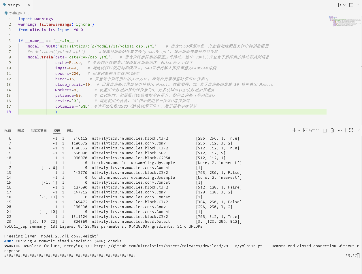 model.train(data='data/CAP/cap.yaml', # 指定训练数据集的配置文件路径,这个.yaml文件包含了数据集的路径和类别信息