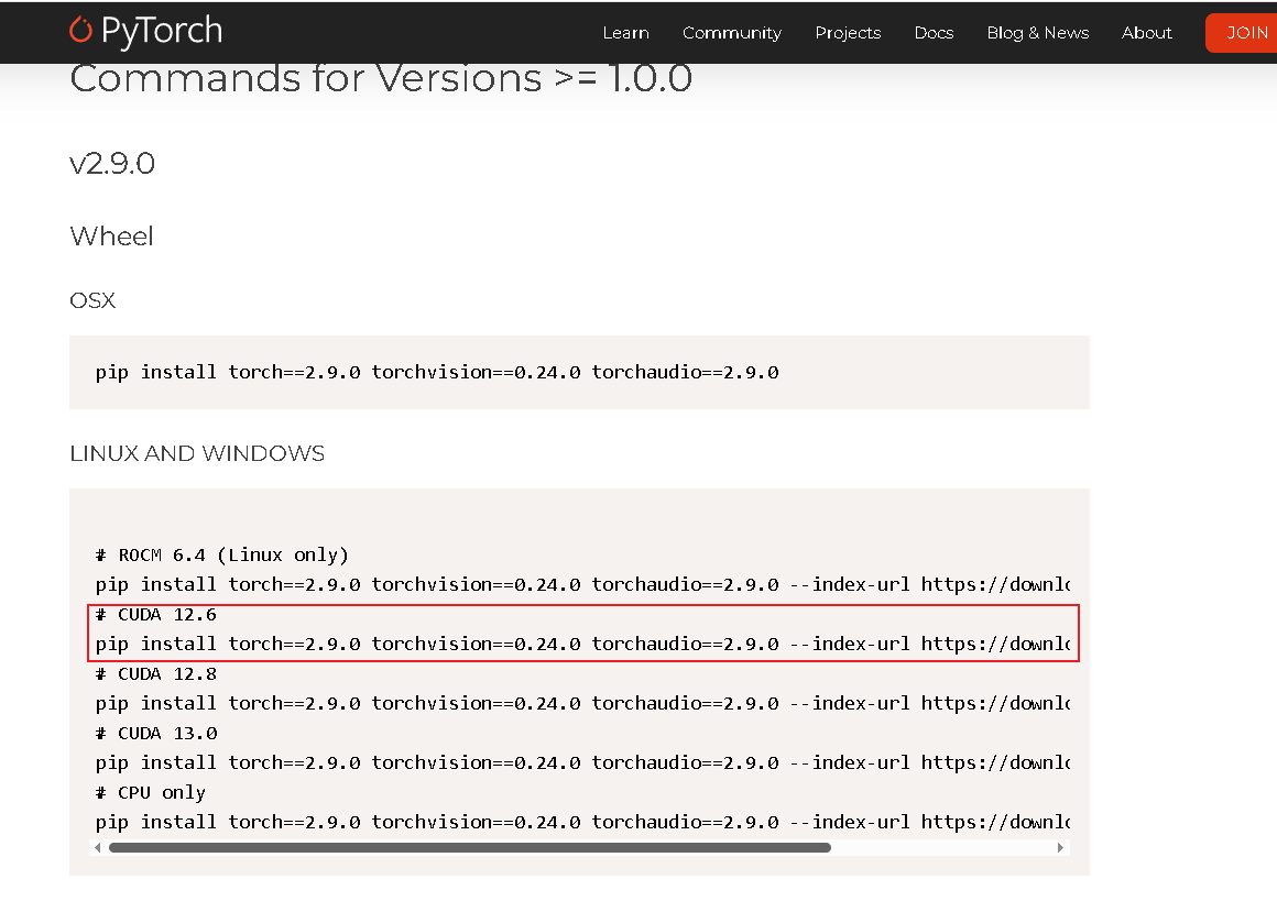 我安装的是12.6对应的版本,官方链接:https://pytorch.org/get-started/previous-versions/