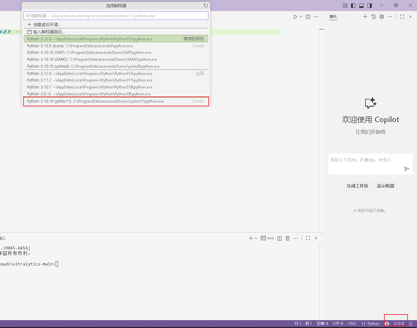 点击右下角的标志,弹出弹窗,选择刚才创建的yolov11虚拟环境