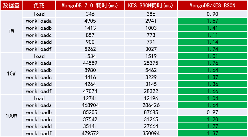 根据官方公布的YCSB基准测试结果,KingbaseES MongoDB兼容版与MongoDB 7.0在六种典型负载场景下进行了对比测试。