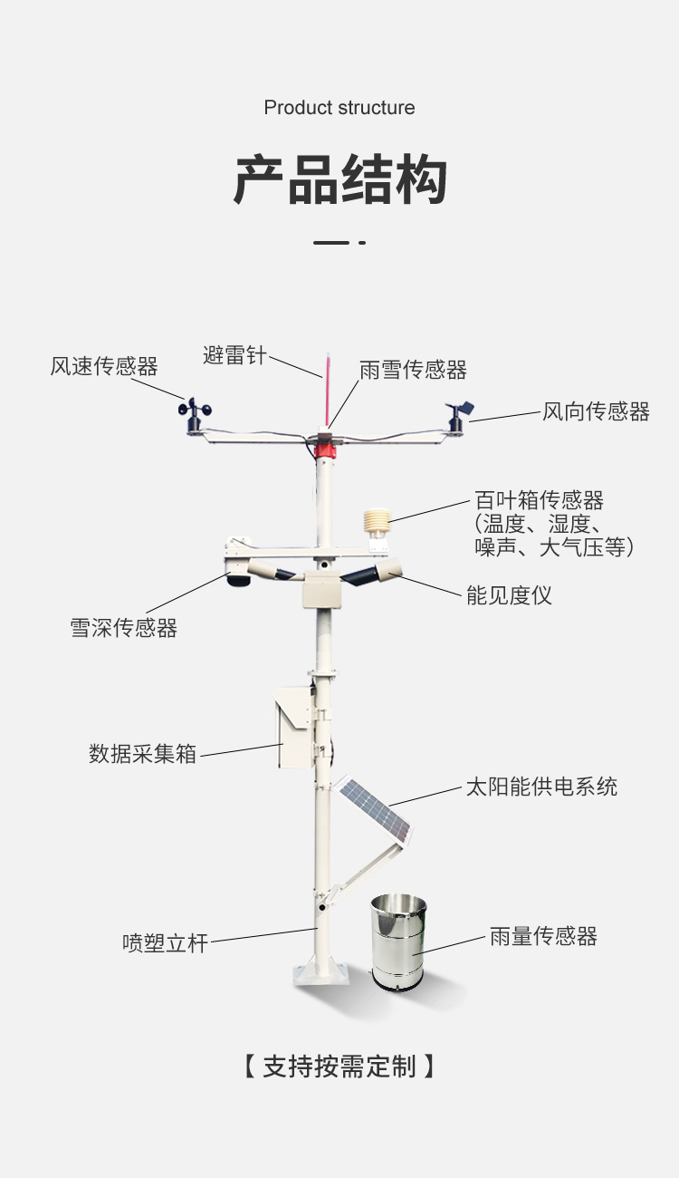 预警先行的前提,是全面、高精度的风险感知。现代道路气象监测站构建起"空-地-路"三维感知体系,突破传统观测的局限,实现气象与路面状态的同步捕捉、细微洞察。空中维度,超声波风速仪、激光云高仪实时追踪风速风向、云系动态,为强对流、暴雨等大范围恶劣天气预警提供数据支撑;地面维度,前向散射能见度仪对团雾、低能见度等局地突发风险敏感捕捉,即便百米内转瞬出现的团雾也能精准识别;路面维度,红外传感器与水膜传感器探测路面温度、干湿程度、结冰厚度,精准区分霜、薄冰、积水等不同风险等级,让每一处隐形风险都能被提前捕捉,为预警发布筑牢数据根基。