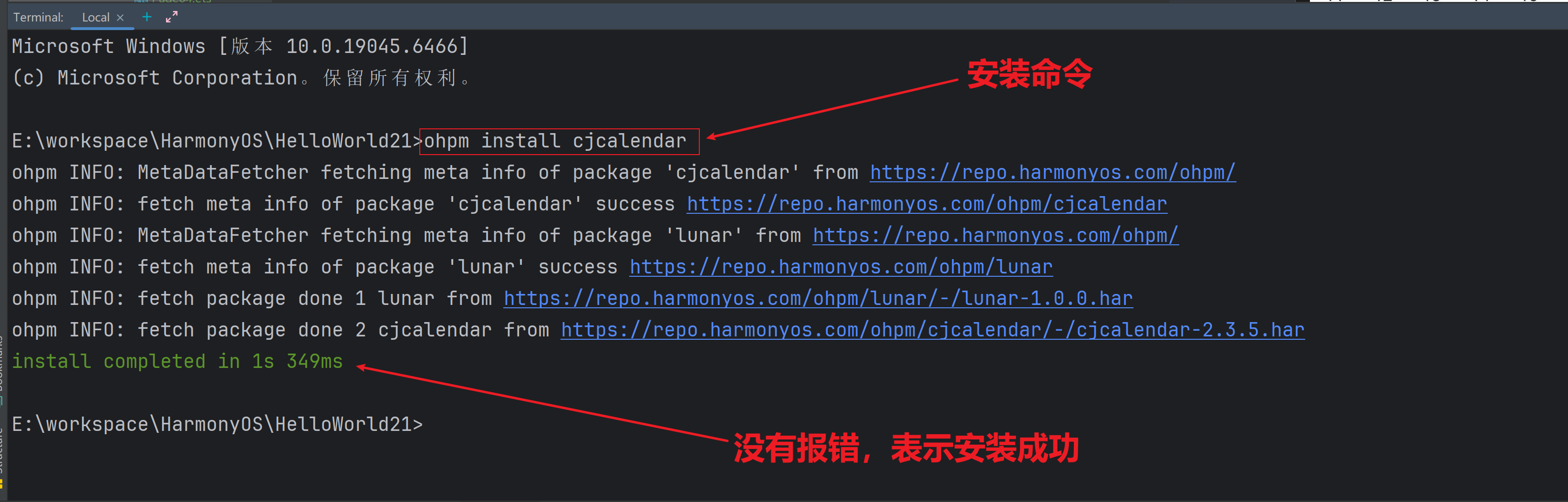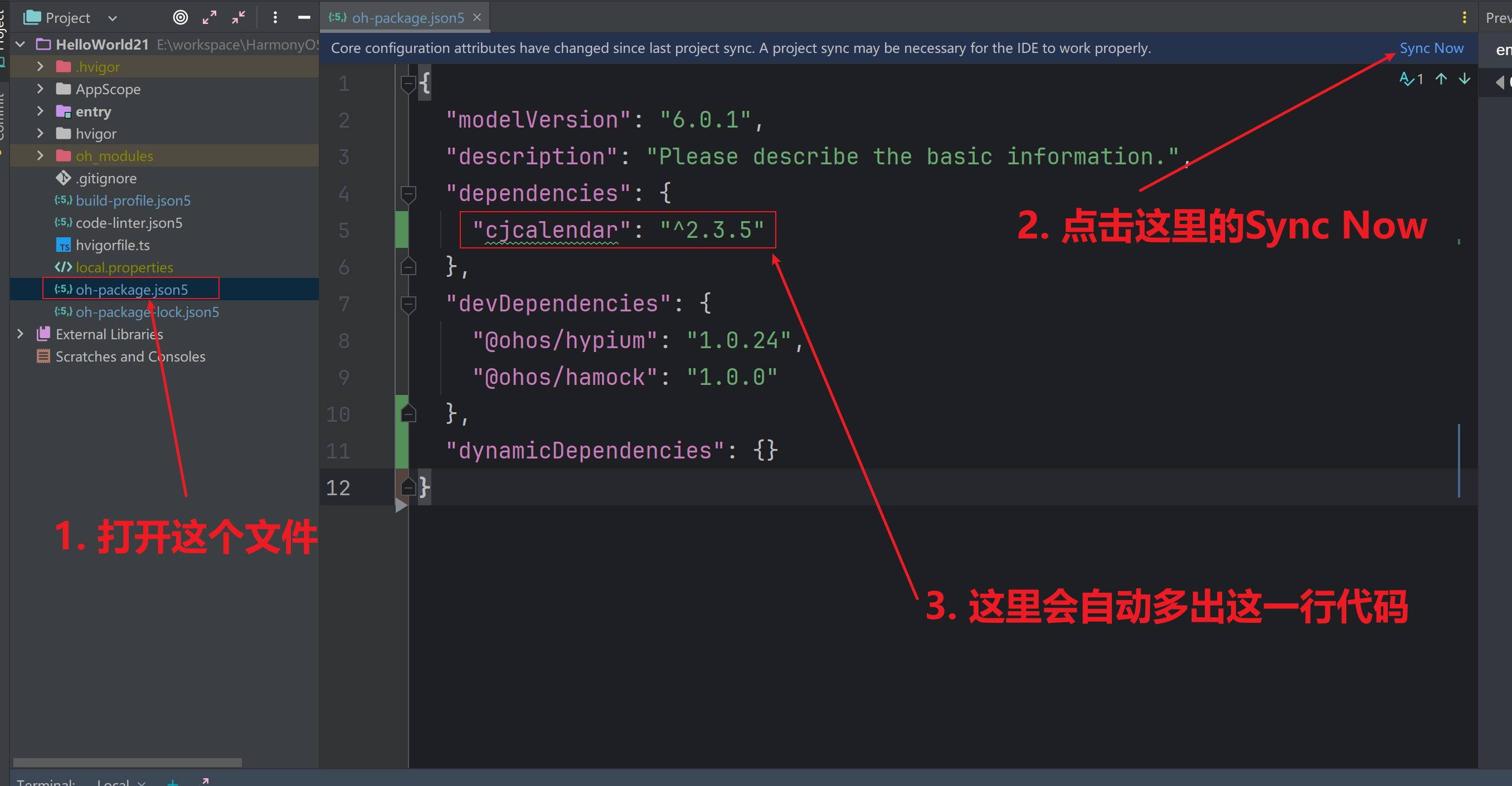 执行成功后,打开项目根目录下的【oh-package.json5】文件,如下: