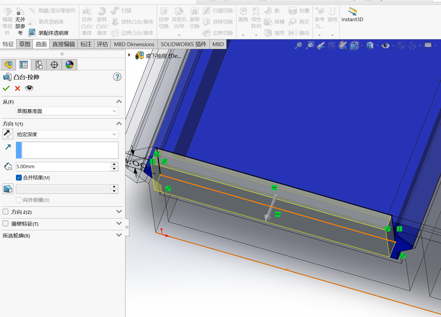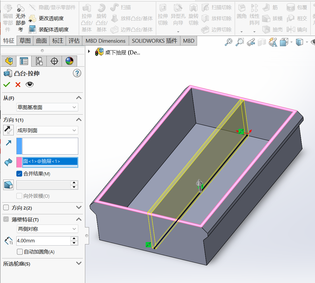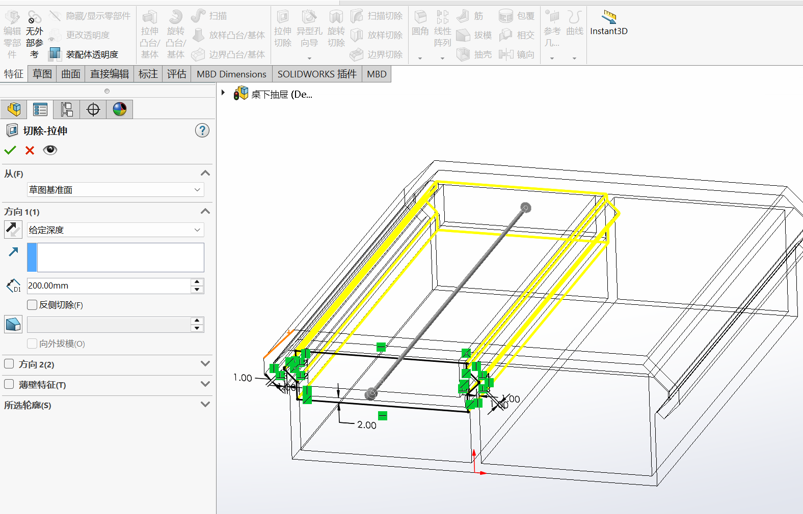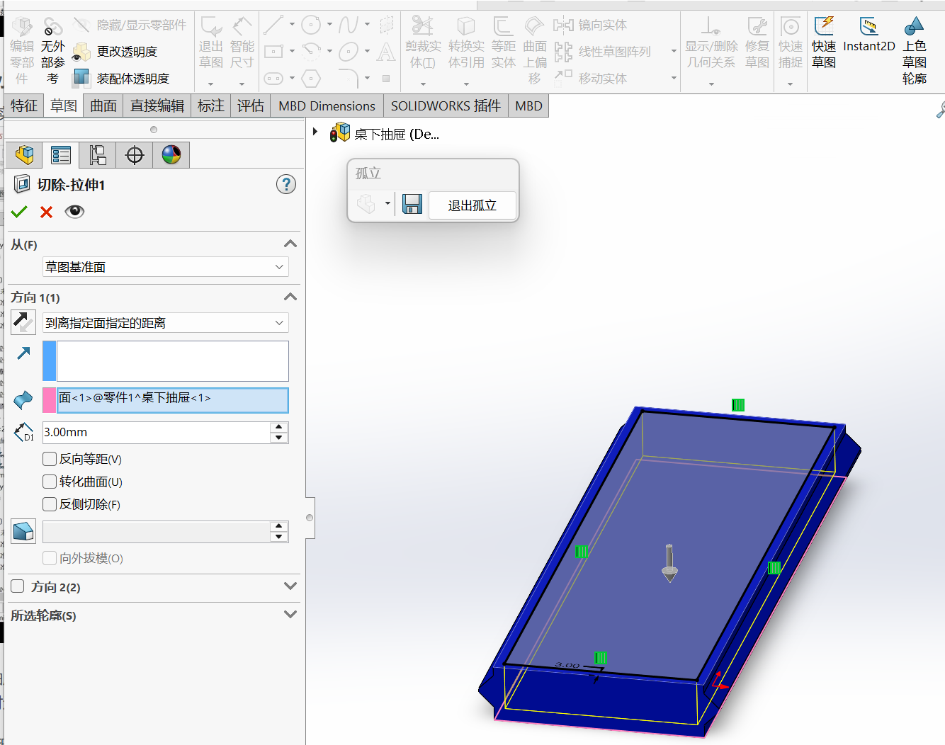 使用拉伸切除,切除抽屉中空部分,使用到离指定面指定的距离。