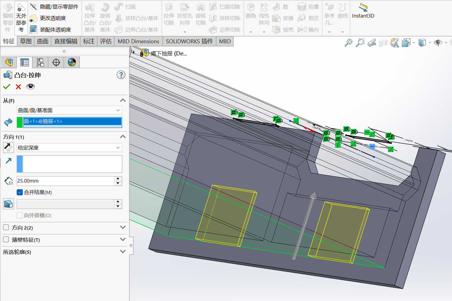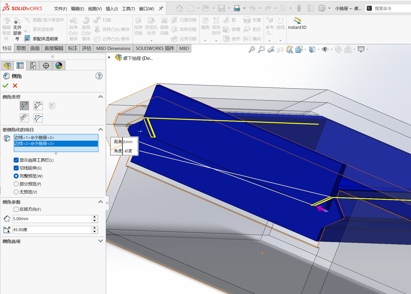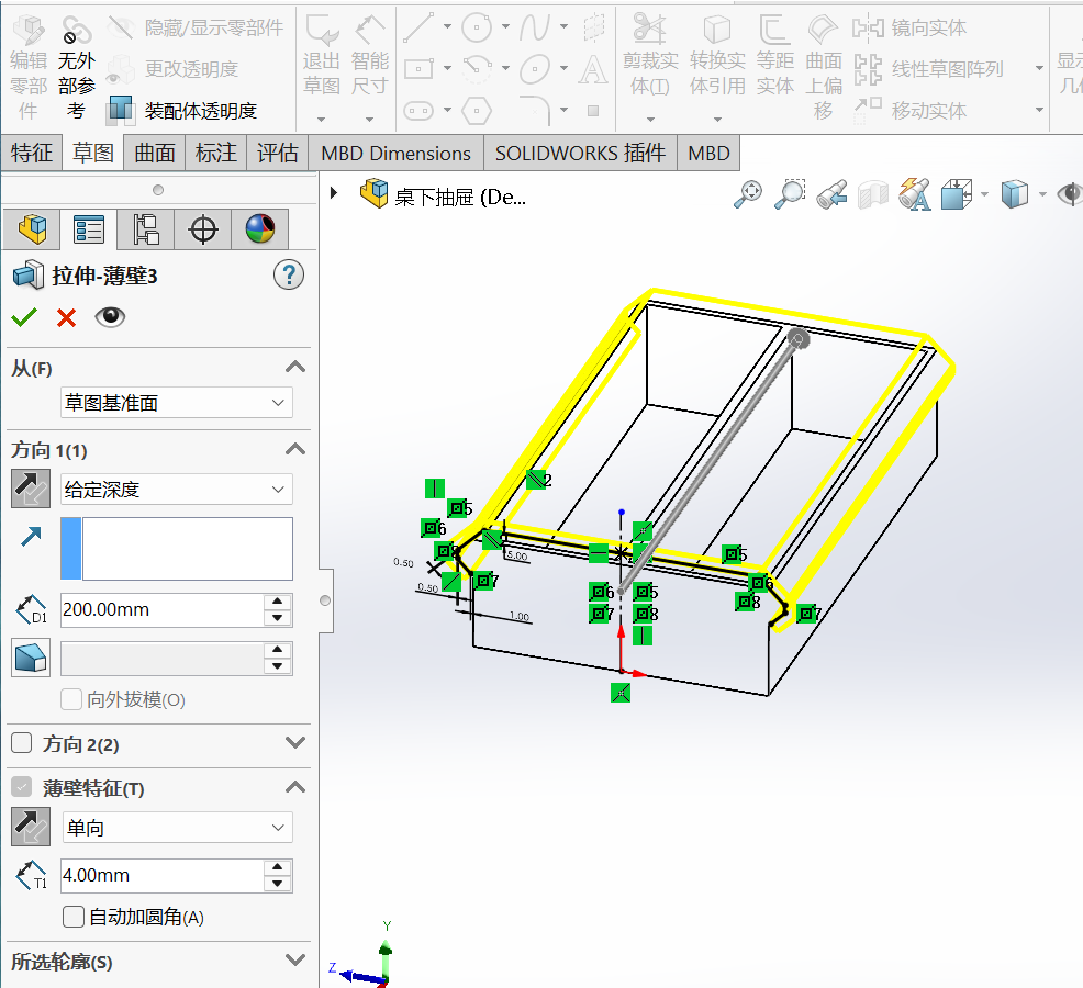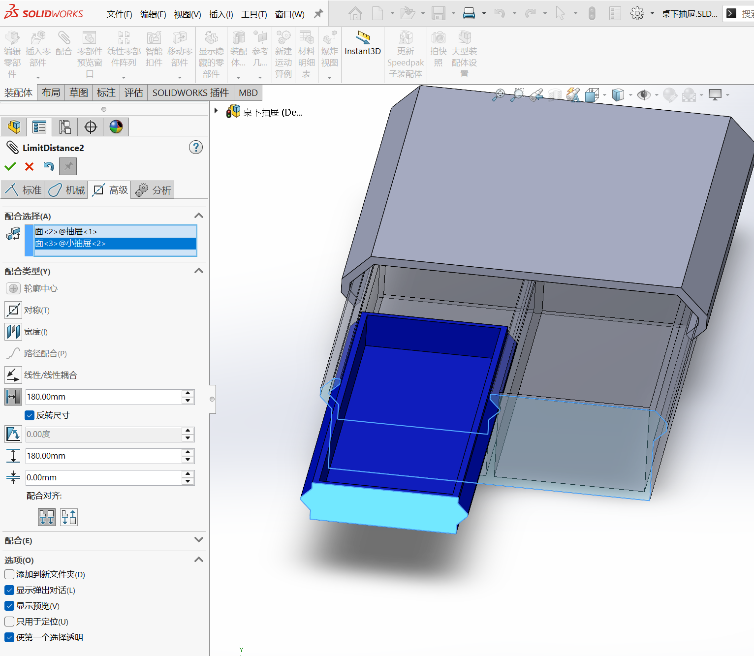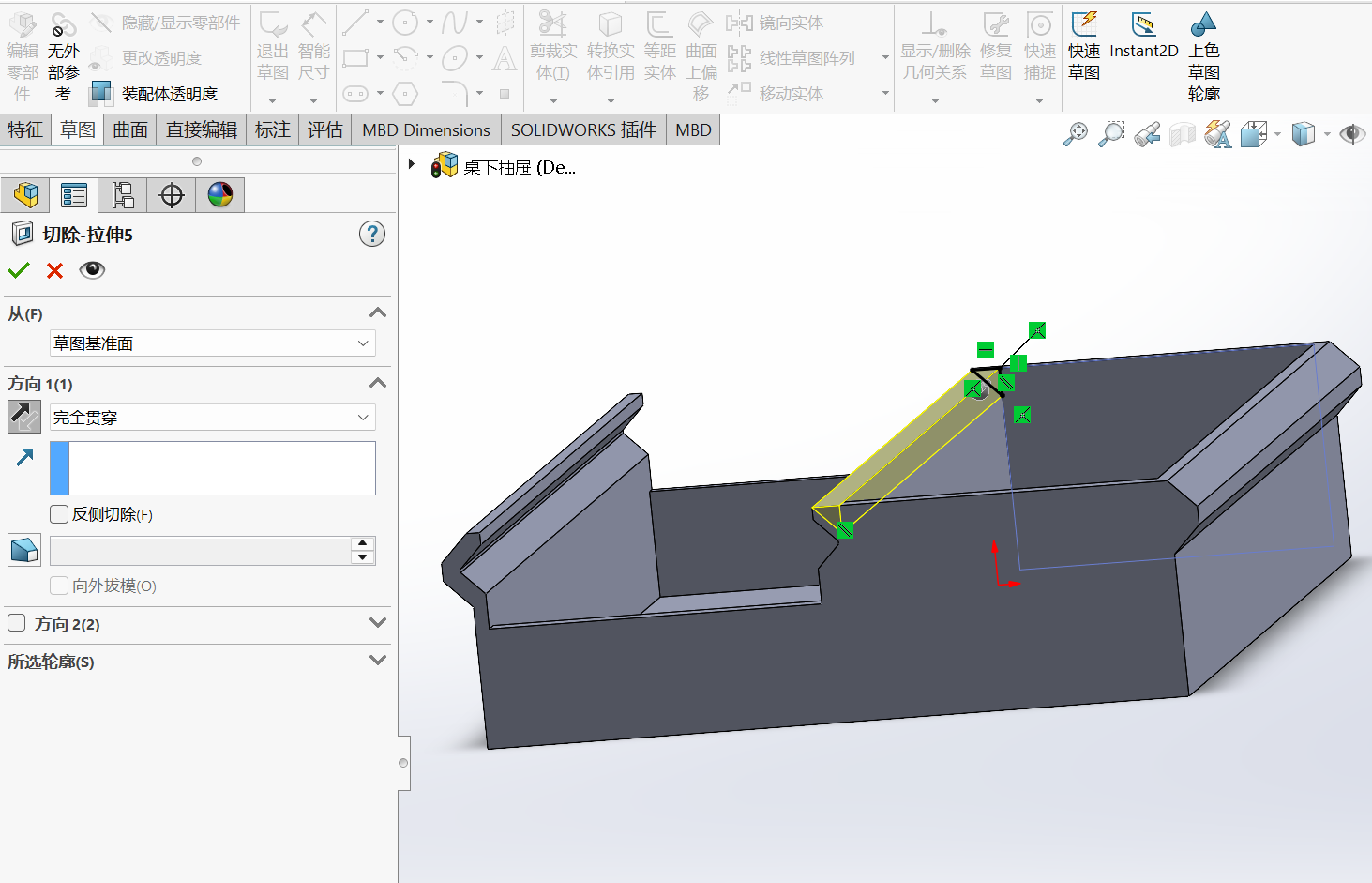 使用拉伸切除,切除抽屉中空部分,使用到离指定面指定的距离。