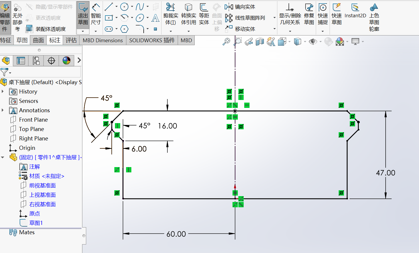 - [ 1、插入新零件,并基于抽屉前面绘制草图。](# 1、插入新零件,并基于抽屉前面绘制草图。)