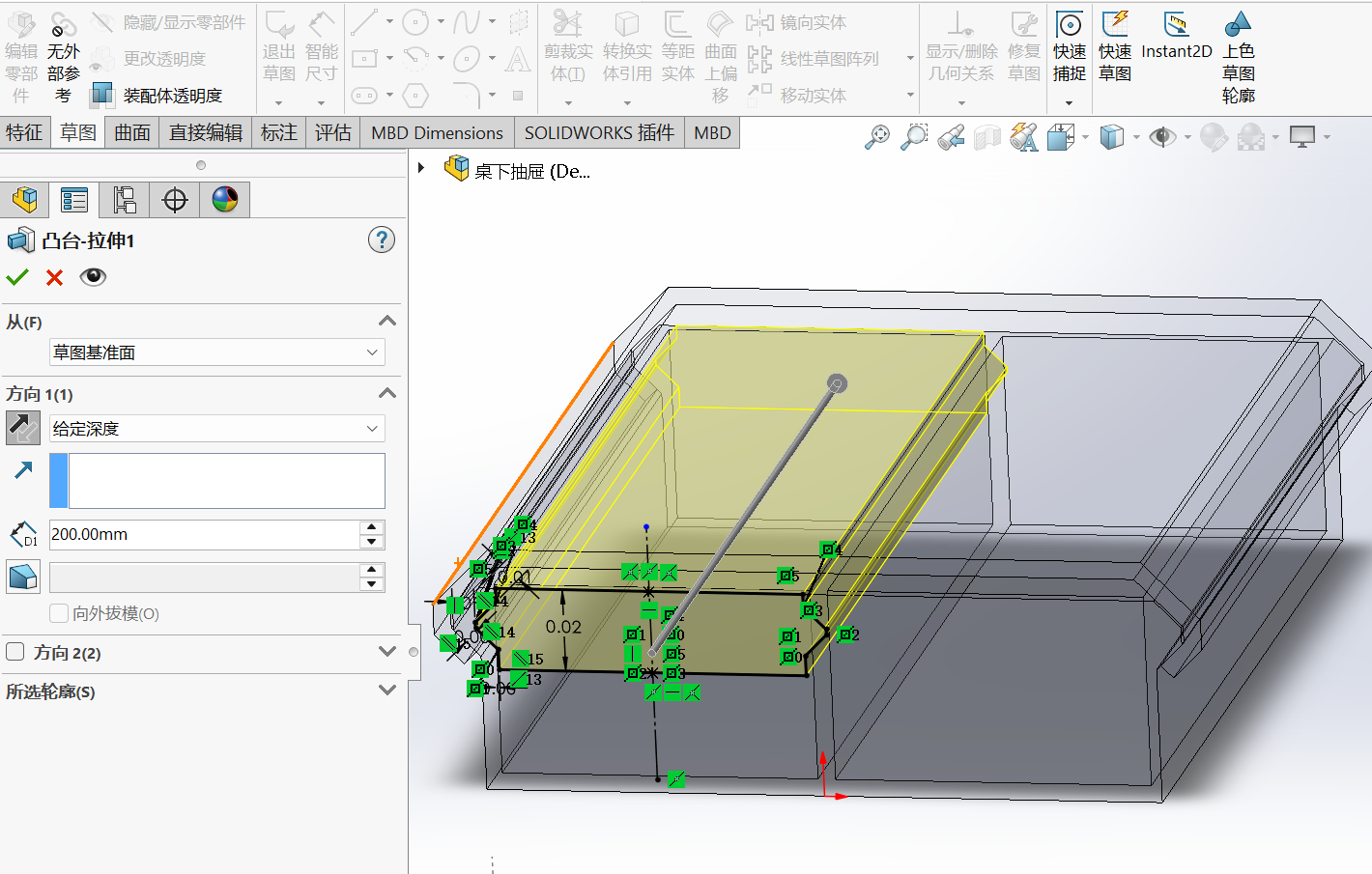特征面板,选择拉伸凸台\基体。设置为给定深度,200mm。