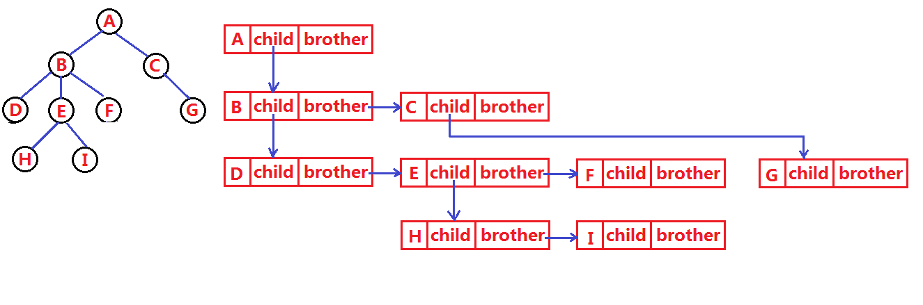 上述表示方法也被叫做左孩子右兄弟表示法。在树的结构体中,只存储了第一个孩子节点和兄弟节点。如上图所示:节点A只存储了第一个孩子B和其兄弟NULL节点。以此类推.......
