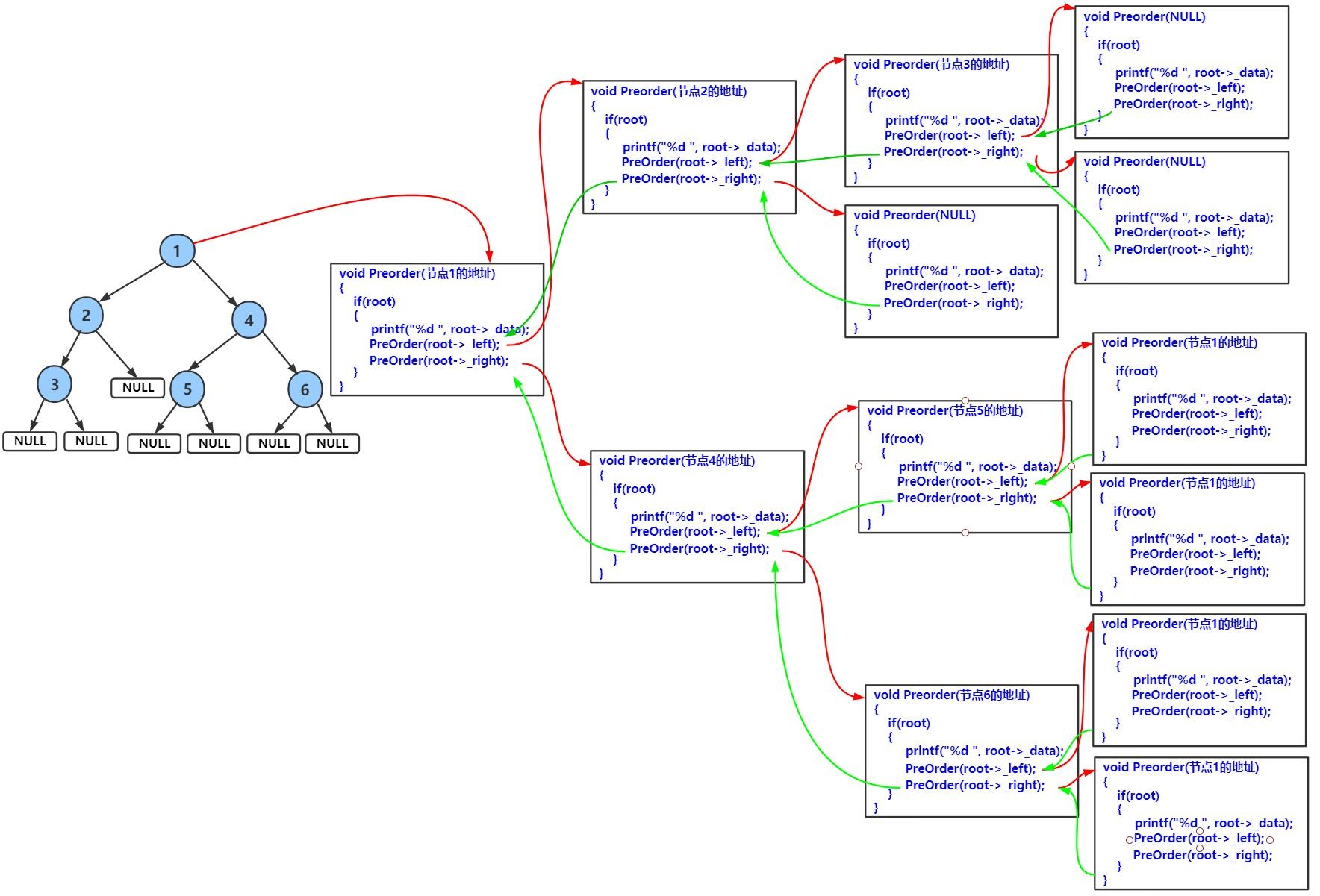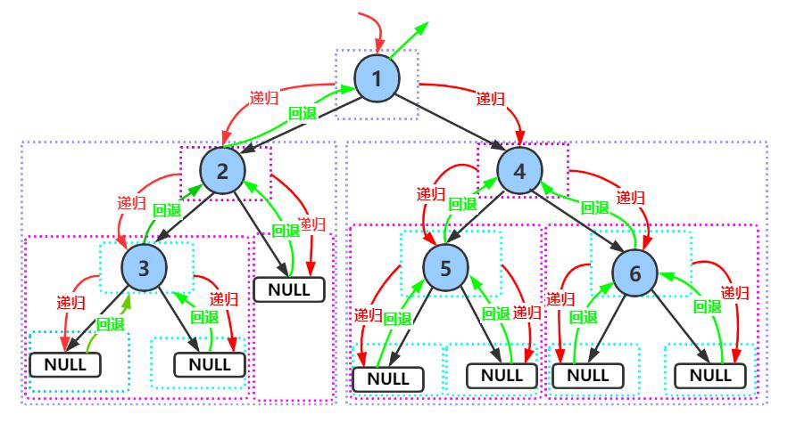 上述先序遍历代码的具体解释:利用递归的思想,先遍历根节点,后遍历左子树,接下来遍历右子树。左子树又可以分为根节点和左右子树。右子树同理,以此类推。最终的根节点为NULL时,说明遍历完毕,返回即可。