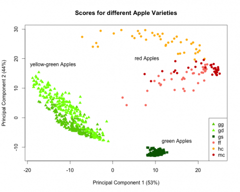 针对目前的数据,不同光谱间的97%多样性可以通过两个主成分来解释分析。不同的苹果具有不同的"分数",比如就像图4所示,将这两种典型物质结合后,就可以将光谱表达成不同维度的数据。同时,我们可以很轻松地将苹果分成三组:绿苹果,红苹果和黄-绿苹果。有了这个图表,我们可以以同样的方式测试未知样品的图谱,获得已知典型物质的分数,然后按照该表格将该苹果进行分类。