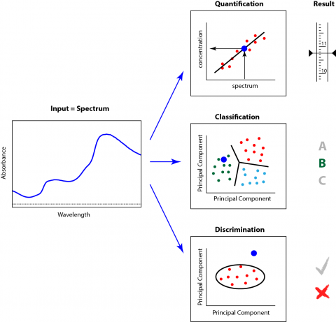 现在被大家认可的,且最常使用的定量方法是偏最小二乘法(PLS),它可以通过光谱数据(反映的"物质")来最有效的分析解释物质的多样性及差别。另一个被普遍使用的分类方法叫支持向量机(SVM),而另一种用来将分析物与标准物进行区别的方法叫主成分分析方法(PCA)。