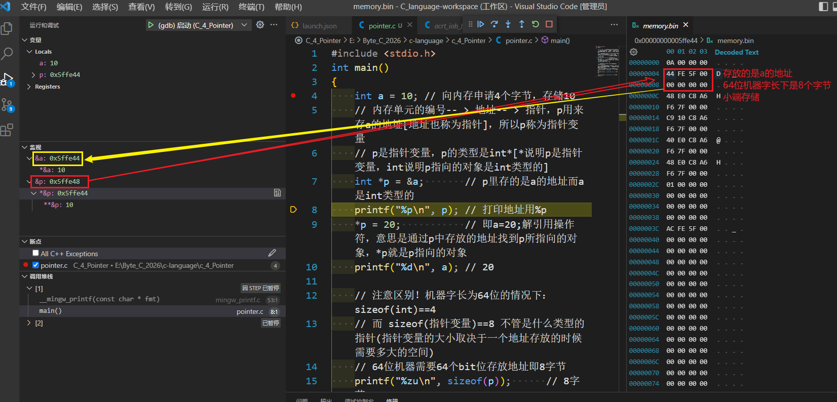 补充:在VSCode-调试看变量a以及指针变量p中保存的的数据