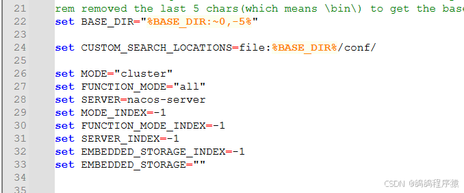 由于windows默认启动nacos是集群模式,用记事本打开后需要将set MODE="cluster" 改为:set MODE="standalone"