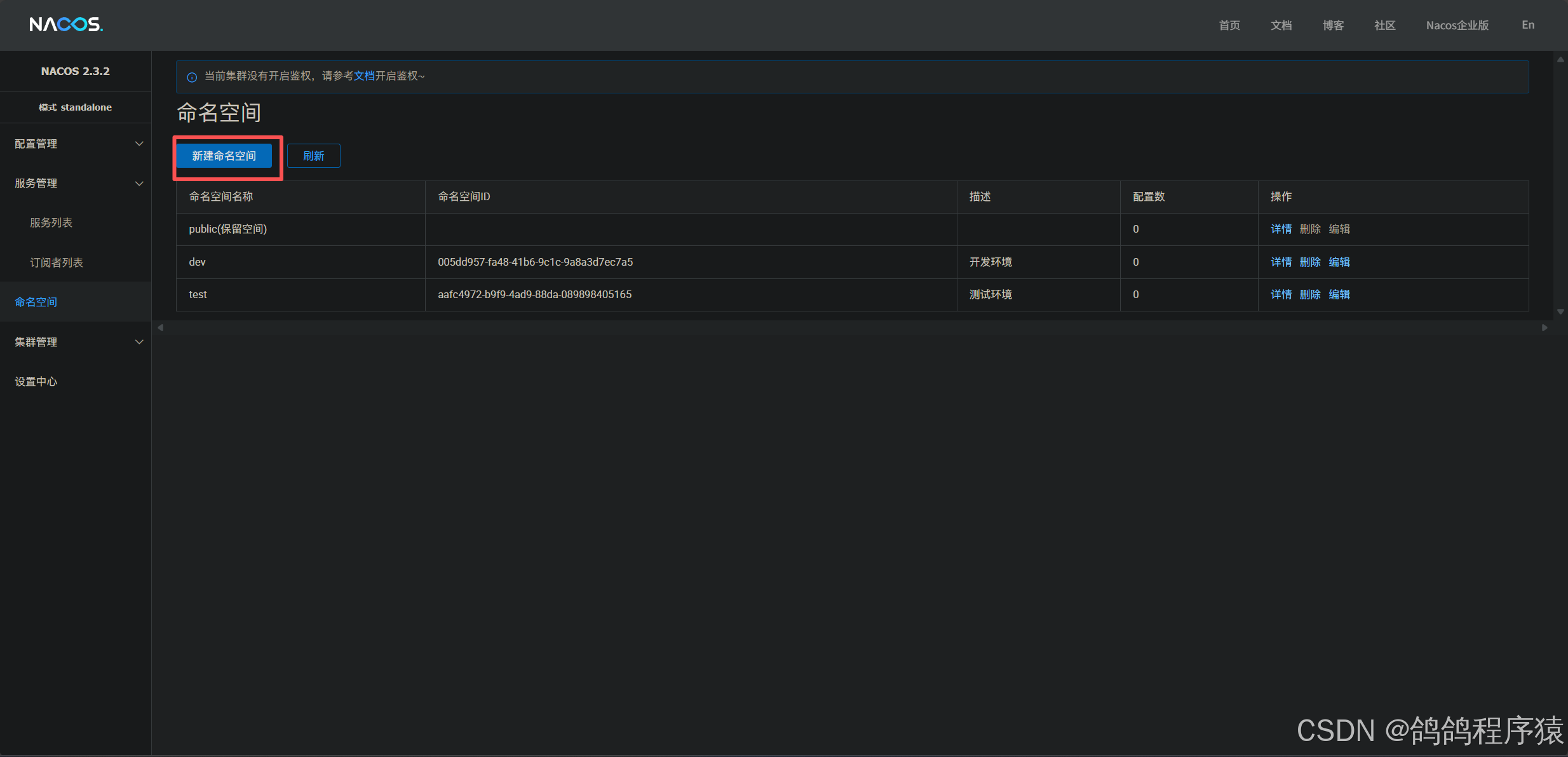 通常情况下,这⼏个环境是不能互相通信的。Nacos提供了namespace(命名空间)来实现环境的隔离。不