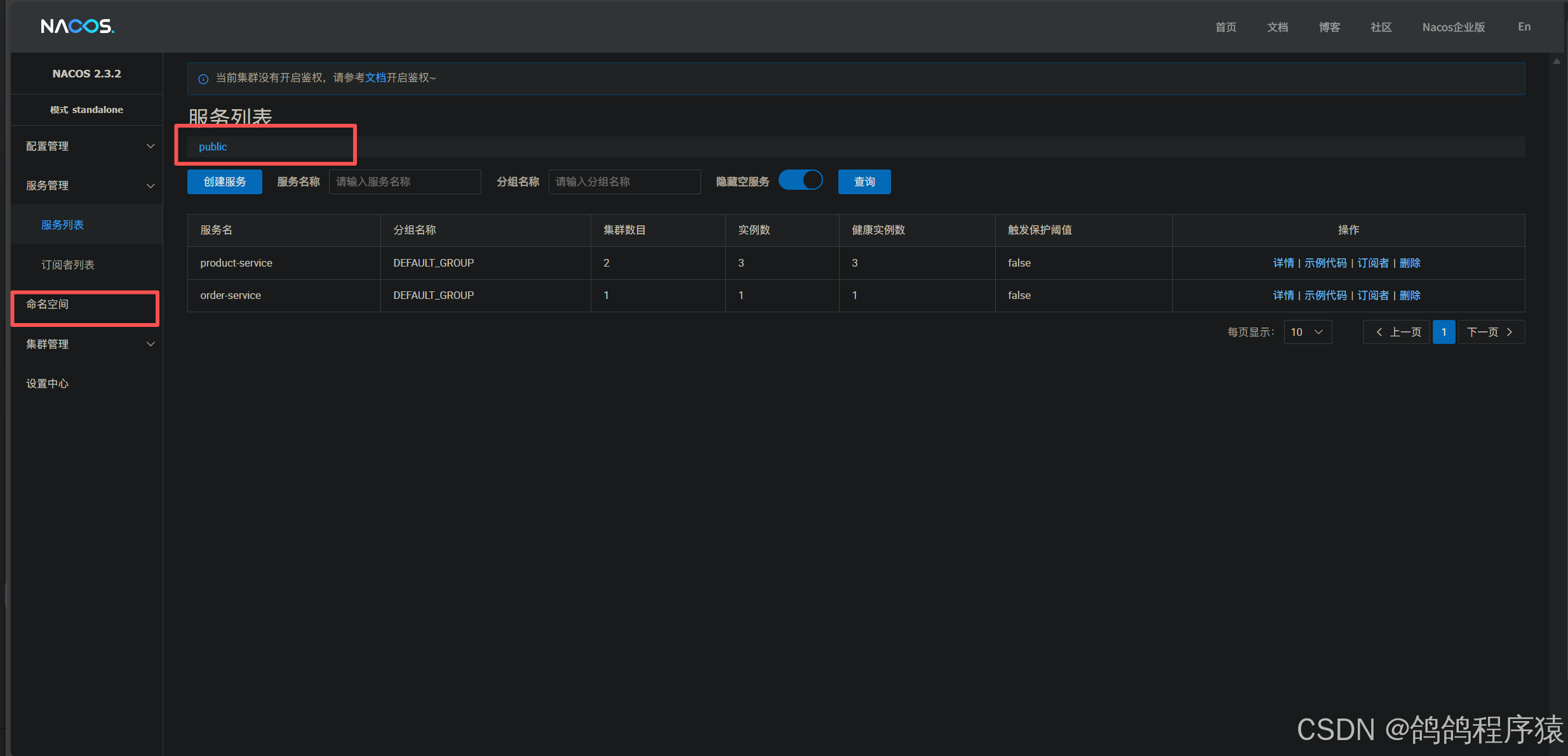 Nacos配置管理的命名空间和服务列表的命名空间是分别设置的.默认是public