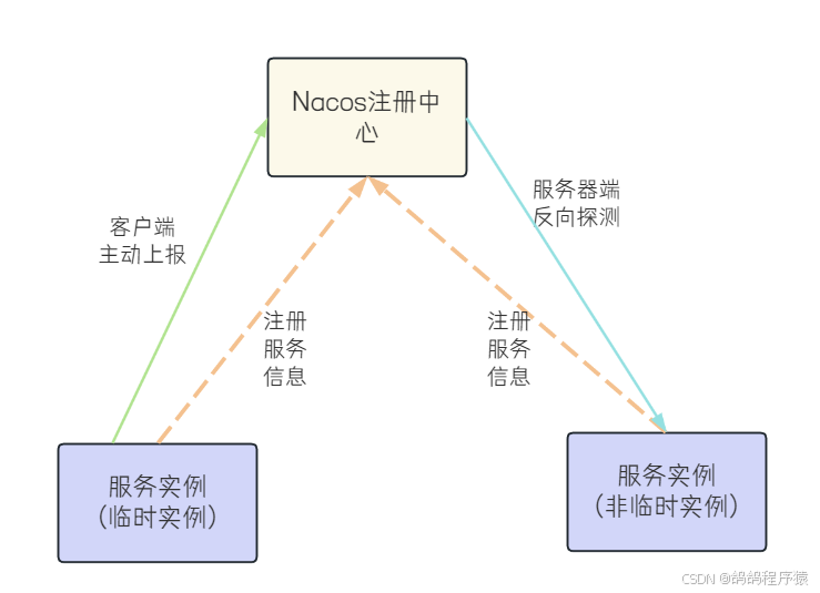 Nacos对临时实例,采取的是 客⼾端主动上报机制,对⾮临时实例,采取服务器端反向探测机制。