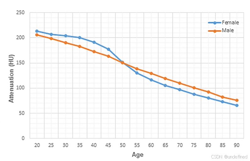 图3:L1椎体平均骨小梁衰减值(HU)随年龄和性别的变化曲线。