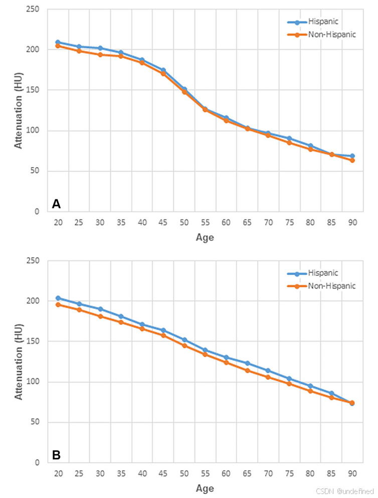 图6:西班牙裔与非西班牙裔患者的骨密度对比(A为女性,B为男性)。