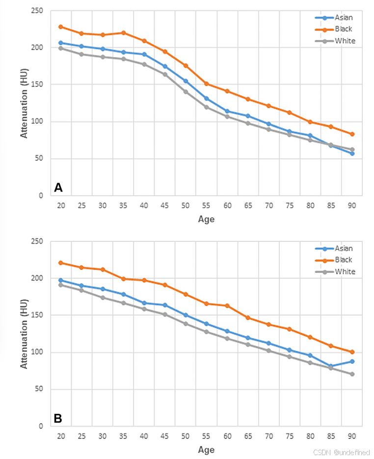 黑人(Black)患者: 骨小梁衰减值最高。