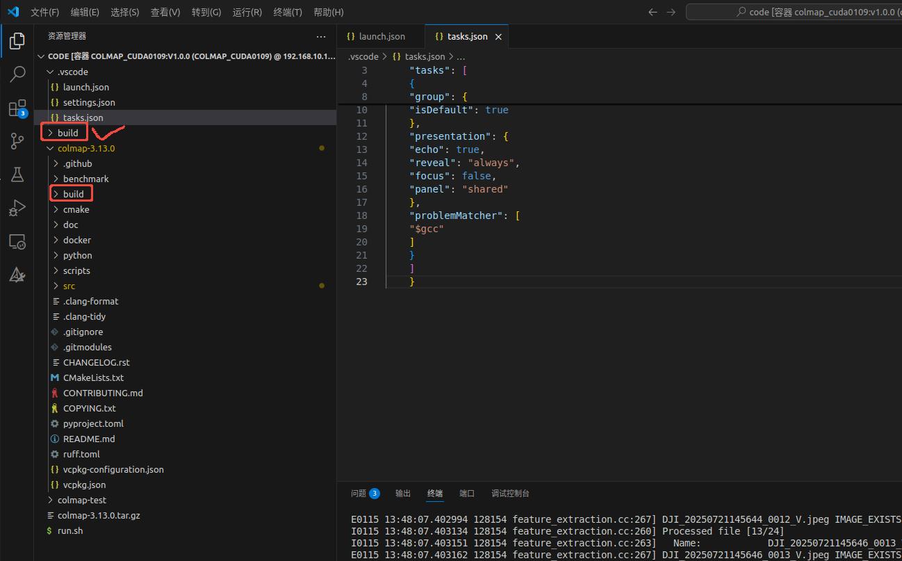 "args": ["feature_extractor", "--database_path", "/root/code/colmap-test/sh24/database.db", "--image_path", "/root/code/colmap-test/sh24/images"], // 调试时传入的参数,对应你的--message
