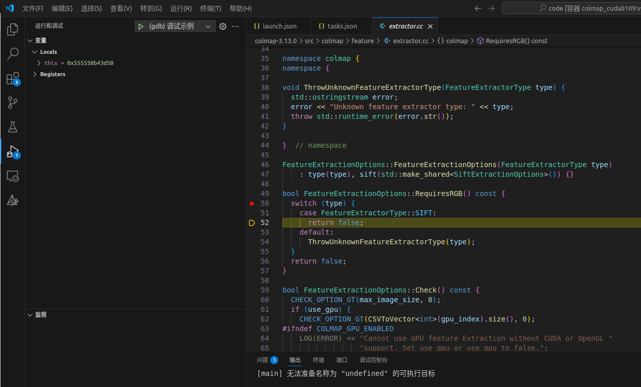 打上断点后发现已经可以正常调试了,这样后面想要优化colmap就方便了