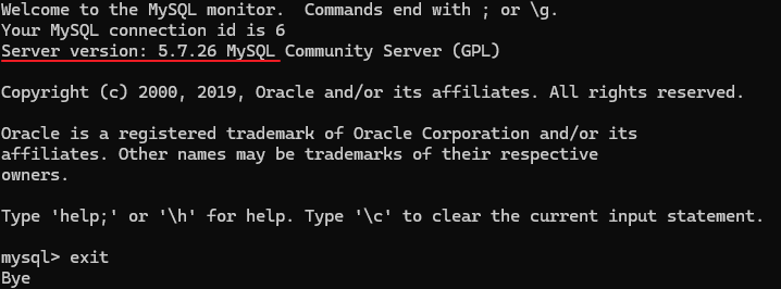 应显示:mysql Ver 14.14 Distrib 5.7.26, for Linux (x86_64)