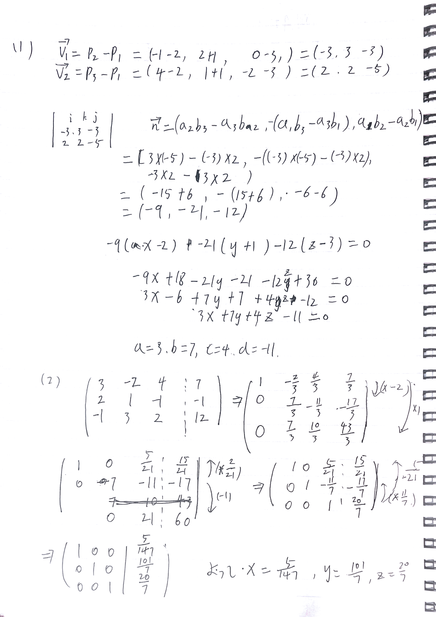 \\vec v_1=P_2-P_1=(-3,3,-3),\\quad \\vec v_2=P_3-P_1=(2,2,-5)