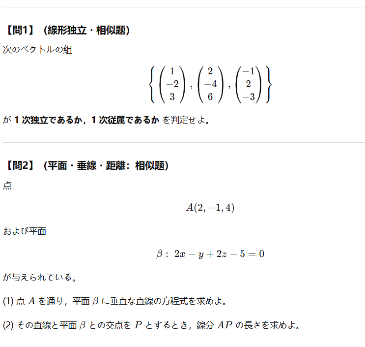 が 1 次独立であるか,1 次従属であるか を判定せよ。