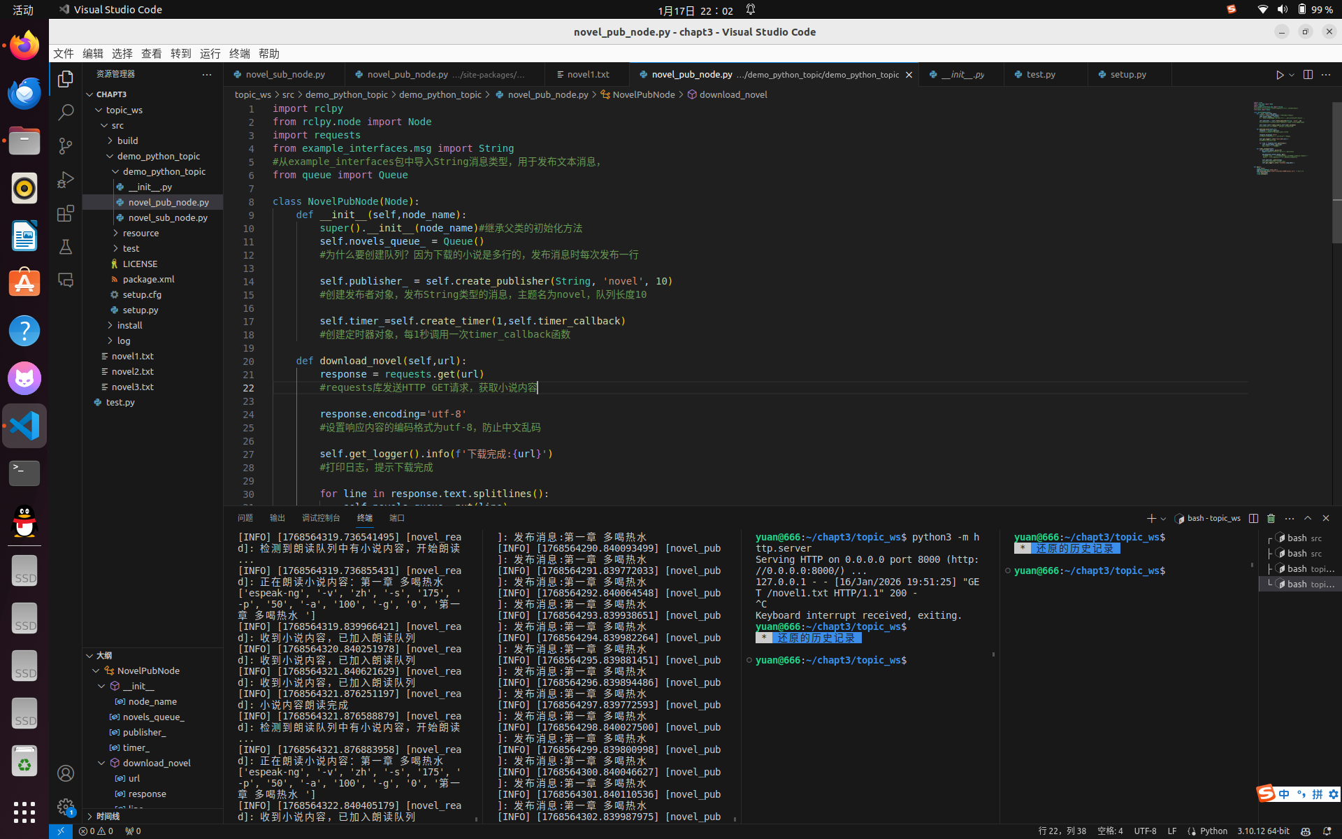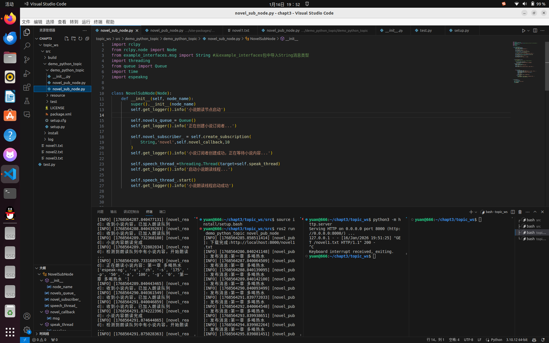 依赖工具/库:requests(下载小说)、espeakng(语音朗读)、queue(队列管理)、threading(多线程),以及ROS2内置的example_interfaces消息类型(用于文本传输)。