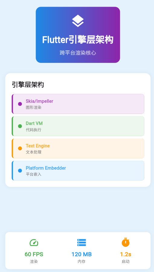 | Engine层 | C++ | 渲染、执行、通信 | 中度依赖 | Skia、Dart VM、Text、Platform Channel |