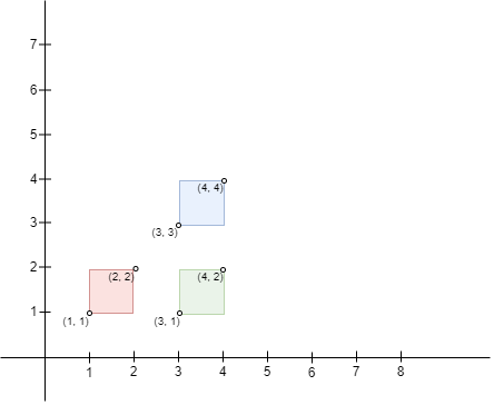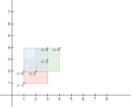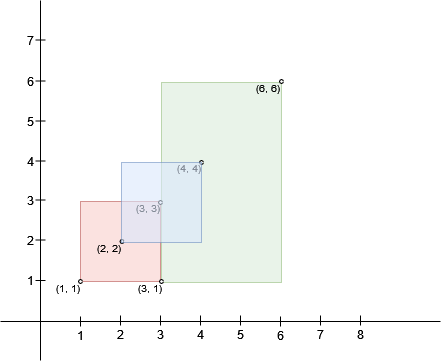 n == bottomLeft.length == topRight.length2 <= n <= 103bottomLeft[i].length == topRight[i].length == 21 <= bottomLeft[i][0], bottomLeft[i][1] <= 1071 <= topRight[i][0], topRight[i][1] <= 107bottomLeft[i][0] < topRight[i][0]bottomLeft[i][1] < topRight[i][1]