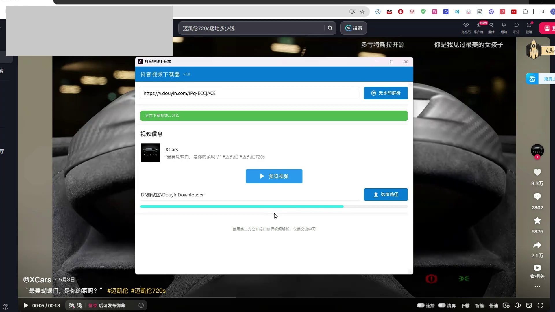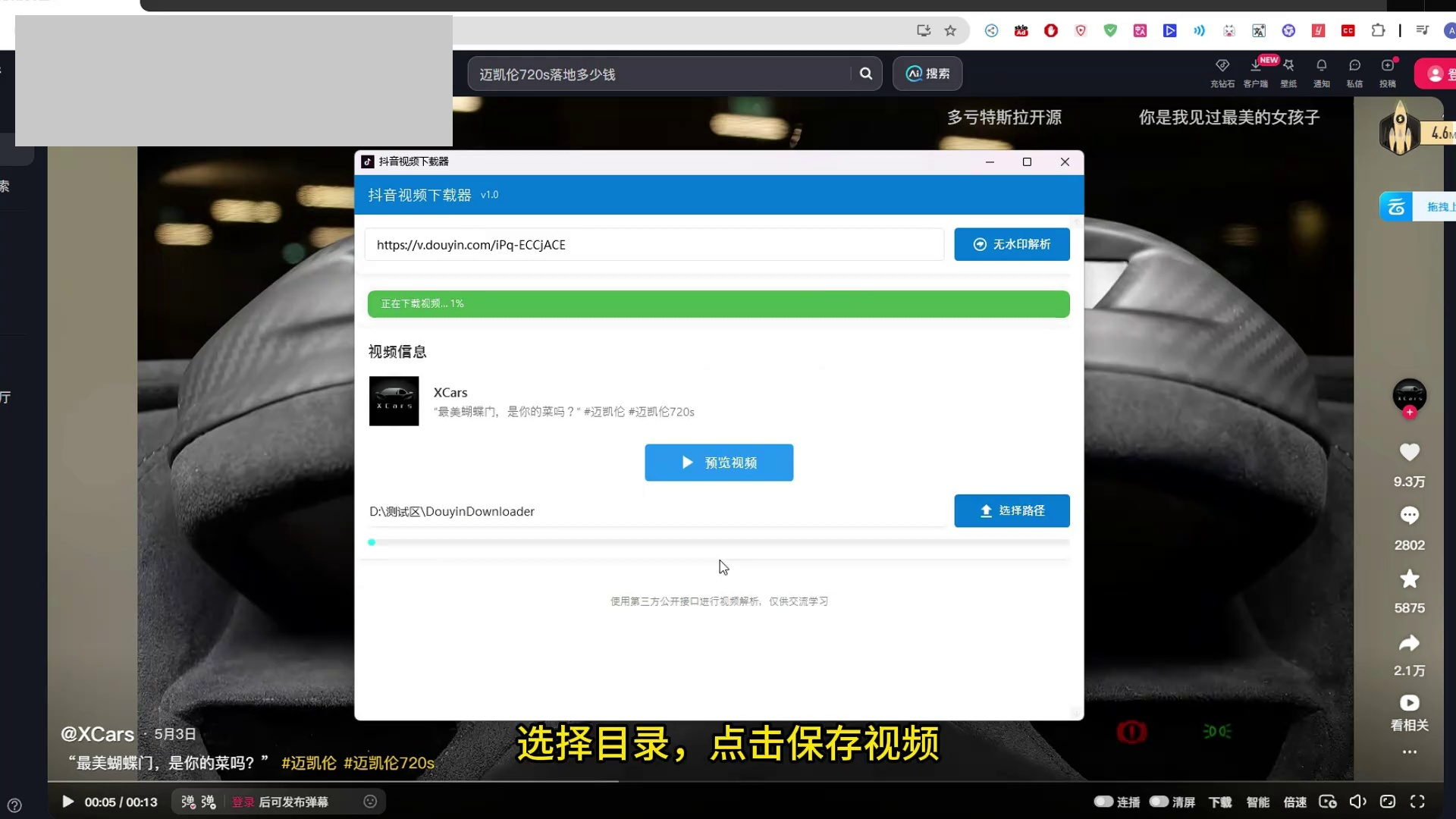 完成 :等待进度条走完,提示下载成功。现在,去你刚选择的文件夹里,就能找到那个高清无水印的抖音视频文件 了!