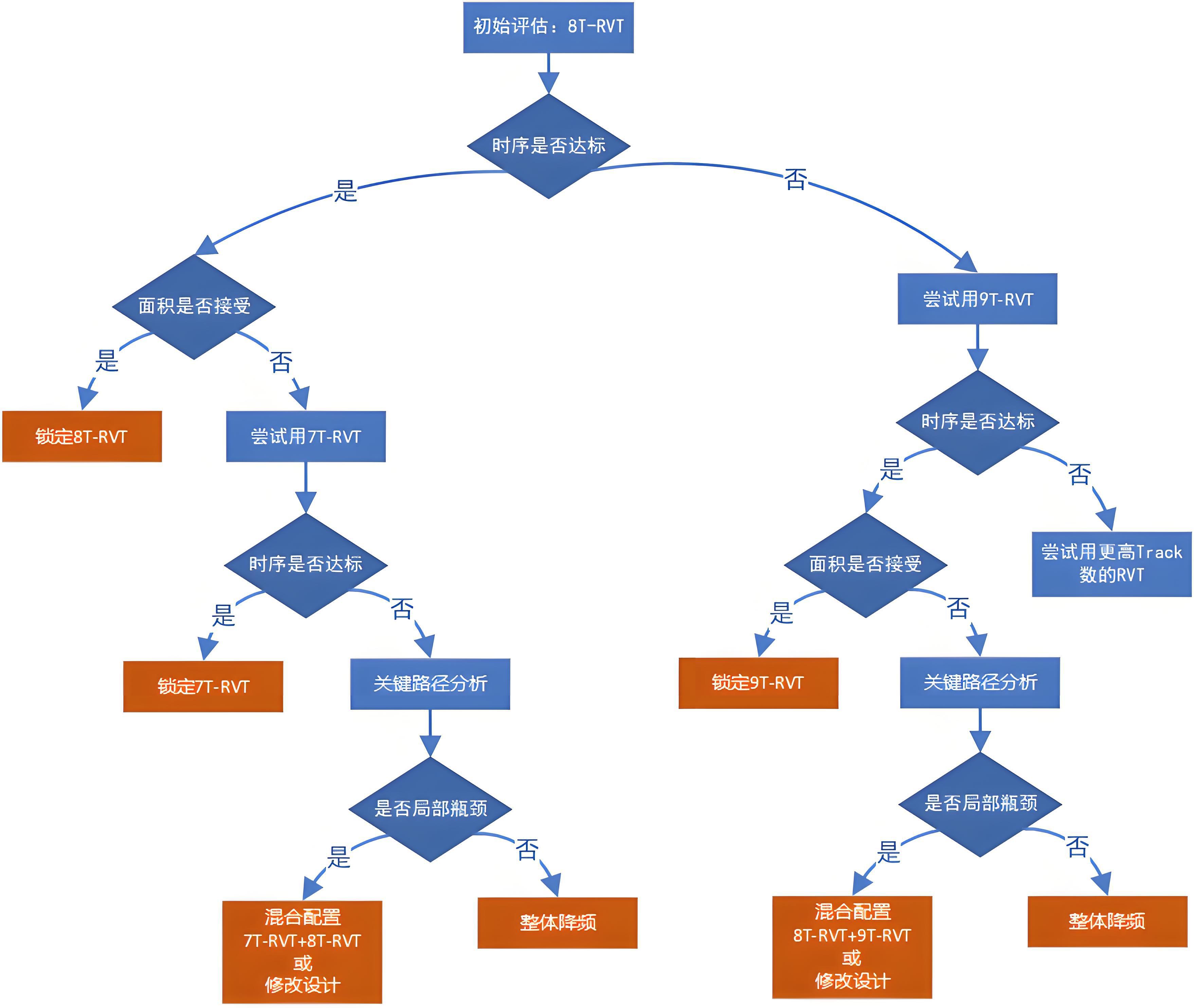 VT选择关乎性能与功耗的权衡:HVT(高阈值电压)功耗最低但速度慢,适用于非关键路径;LVT(低阈值电压)速度快但漏电高,适用于关键时序路径;SVT/RVT(标准阈值电压)则在两者间折中。