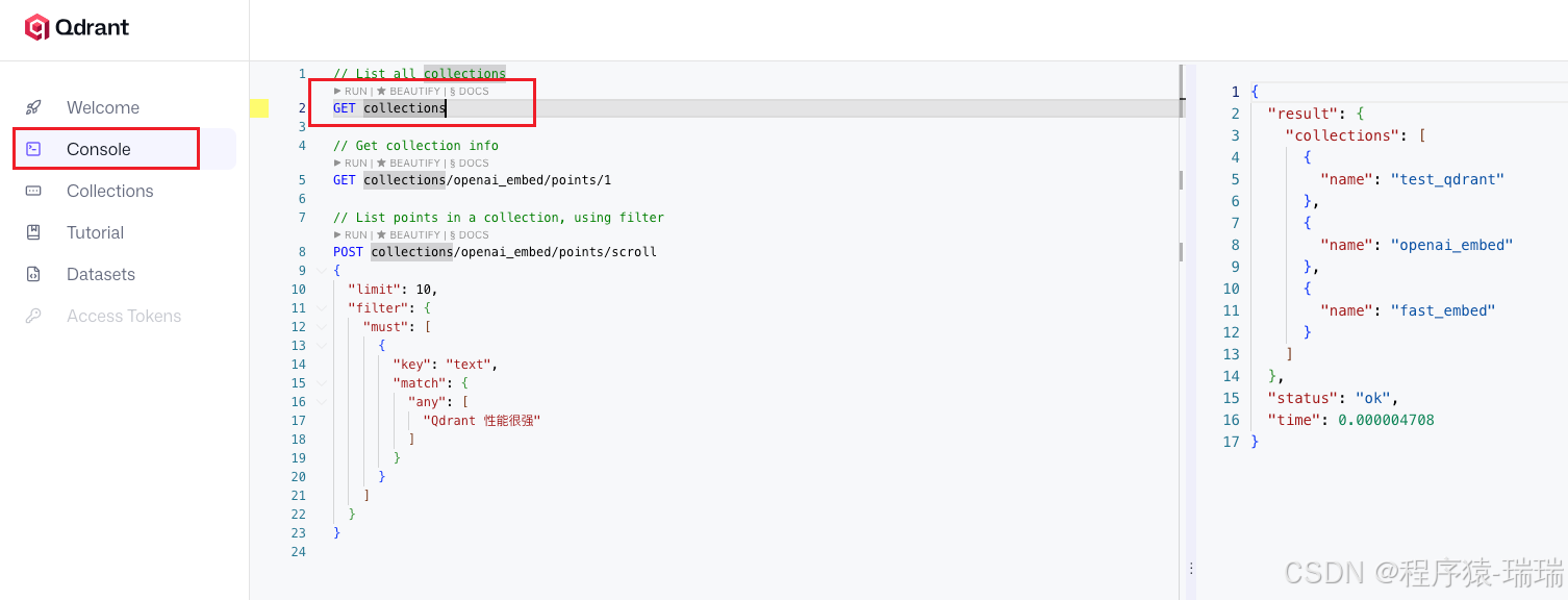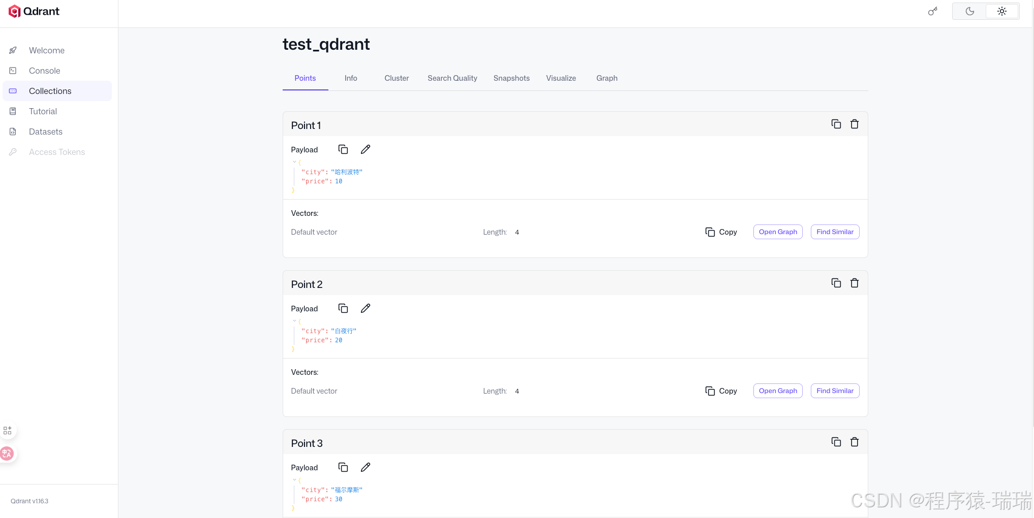 Qdrant 启动极快,通常几秒钟就好。它自带一个非常漂亮的 Web UI 仪表盘(访问 http://localhost:6333/dashboard),可以查看集合状态和数据。