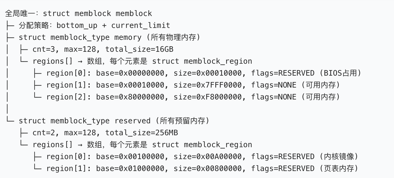 struct memblock_type memory; // 核心:管理【系统所有物理内存】的memblock_type