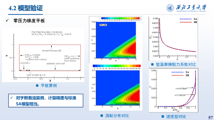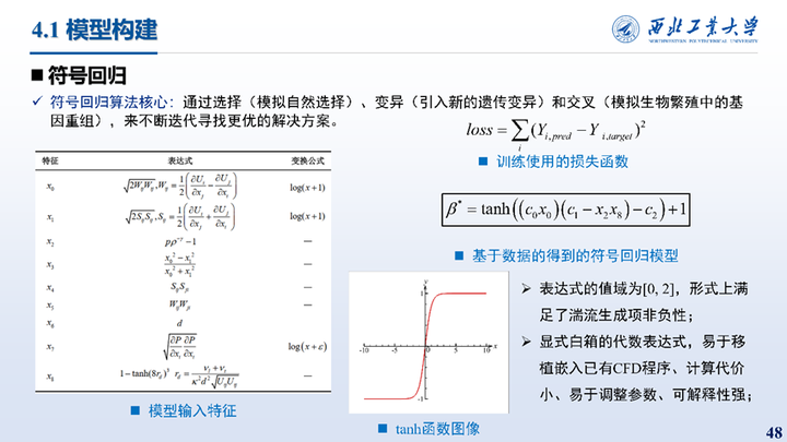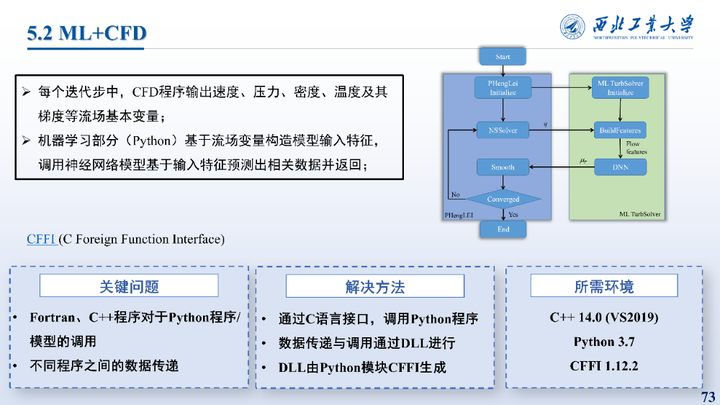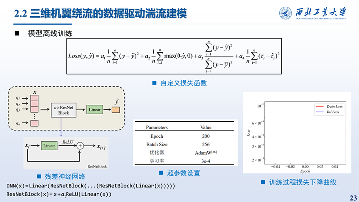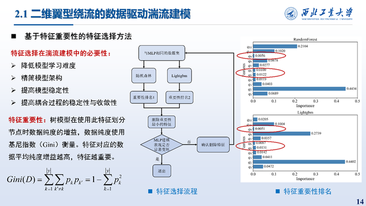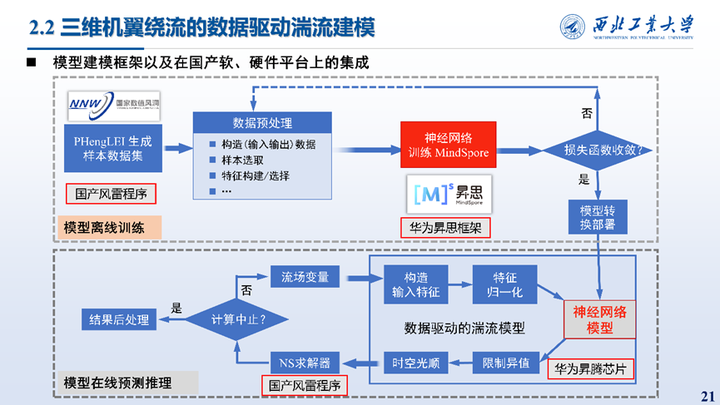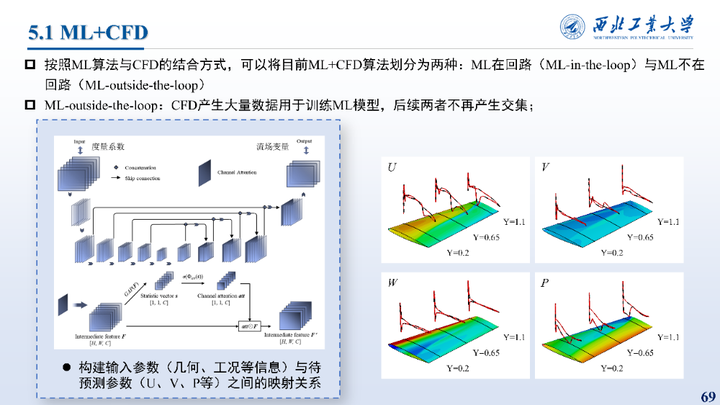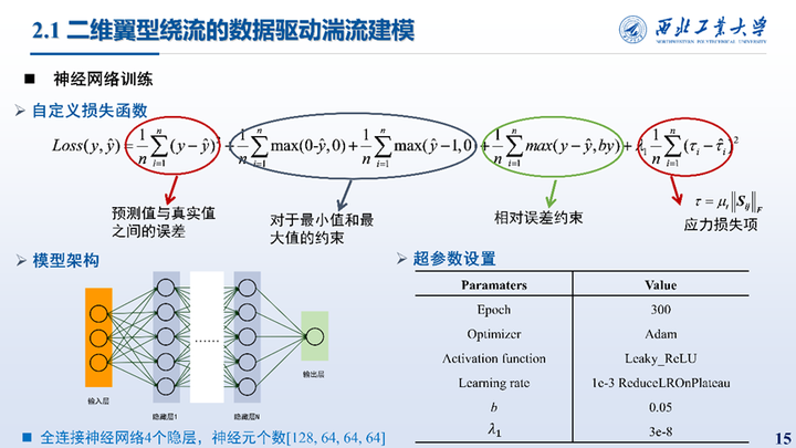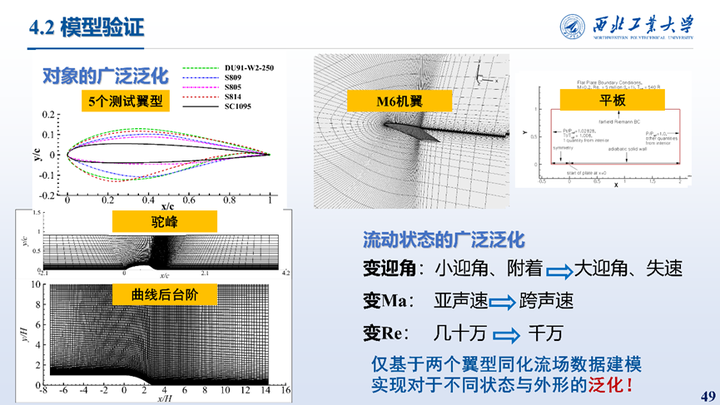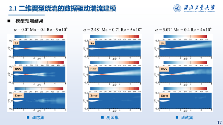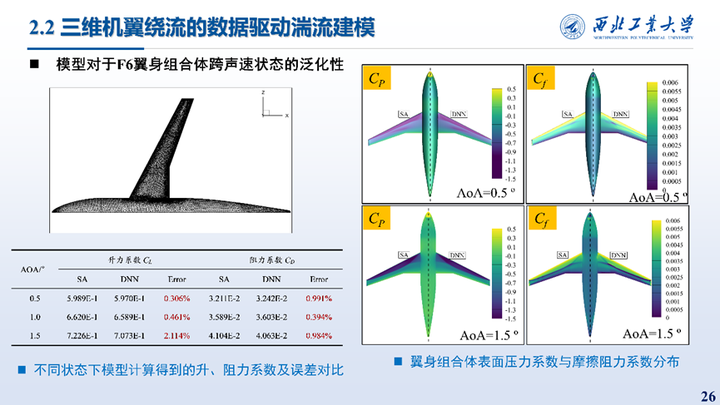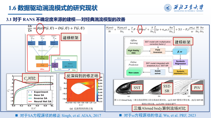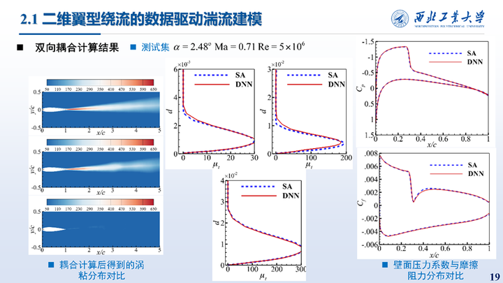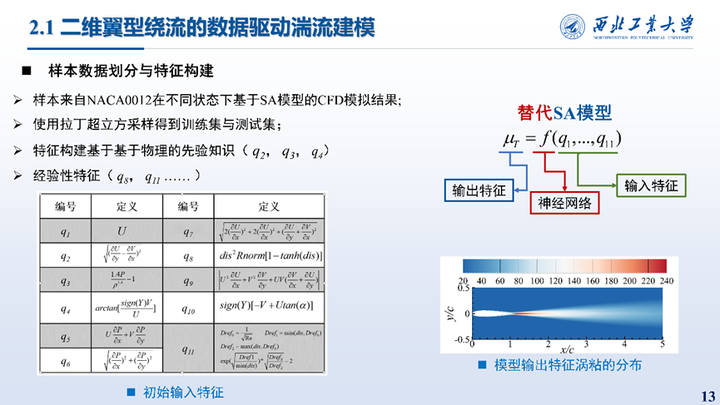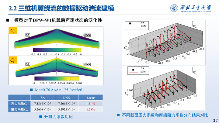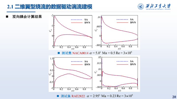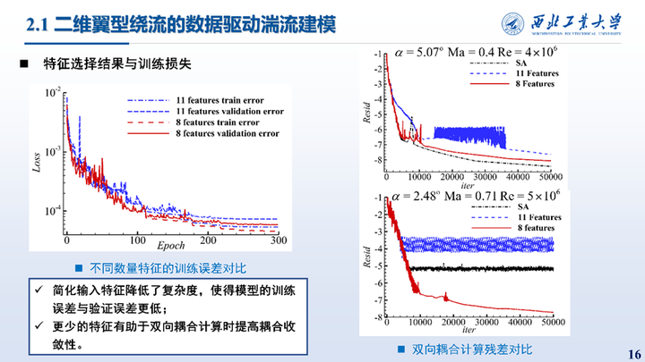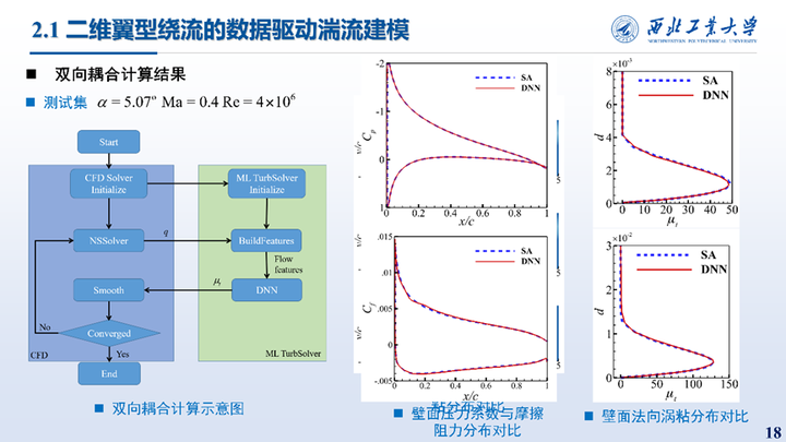 1\] Sun X, Liu Y, Zhang W, et al. Development and deployment of data-driven turbulence model for three-dimensional complex configurations \[J\]. Machine Learning: Science and Technology, 2024, 5(3): 035085. (SCI: 001324082700001, 二区/JCR Q1, IF: 6.4) \[2\] Sun X, Cao W, Shan X, et al. A generalized framework for integrating machine learning into computational fluid dynamics \[J\]. Journal of Computational Science, 2024, 82: 102404. (SCI: 001295434300001, 三区/JCR Q2, IF: 3.1) \[3\] Sun X, Cao W, Liu Y, et al. High Reynolds number airfoil turbulence modeling method based on machine learning technique \[J\]. Computers \& Fluids, 2022, 236: 105298. (SCI:000820618000005, 三区/JCR Q2, IF: 2.5)  博士论文答辩PPT    湍流是流体运动的普遍形态,是国家亟需解决的重要基础课题。湍流的研究方法可以分为三个阶段,早期学者建立理论模型或运用实验技术进行流场测量;后期则发展了数值模拟方法,通过不同的数值格式实现DNS/LES或RANS模拟;近年来,随着海量流场数据的累积和机器学习技术的发展,数据驱动方法成为湍流模拟和建模的新途径。  在湍流数值模拟方面,直接数值模拟、大涡模拟方法虽然具有更高的精度但是成本高昂,目前工程中性价比最高的方法是建立鲁棒、可靠的RANS湍流模式。但是湍流的复杂性给湍流封闭模式带来了重大挑战,特别是在分离流动、二次流动等方面的模拟精度还有待提高。  以往的经典湍流模式研究结合理论分析与标模实验,标定代数或微分方程形式的模型。当前在数据驱动的湍流模式研究中,可以结合湍流数据与机器学习方法,修正或替代经典湍流模式。  当前随着人工智能技术的飞速发展,其为科学研究提供了新的范式。逐渐形成了以大数据 + 知识发现 / 提取为特点的数据驱动研究新范式  在当前数据驱动湍流模式的研究方面,可分为三个方面。早期的数据驱动 RANS 模型研究主要集中在通过区间分析或统计推断来量化并降低模型不确定性而后开始出现了基于高保真数据推断湍流模式方程中待标定系数或对方程各项进行调整的流场反演或数据同化方法  在更进一步的研究中,研究者开始对RANS不确定度来源建模,以期改善RANS模拟精度。这方面的一个代表是对于经典湍流模型的改善,比如对SA模型源项、omega方程破坏项的修正,均取得了较好的结果  接着是直接对雷诺应力的修正,代表性工作是使用机器学习方法,弥补RANS雷诺应力与真实雷诺应力之间的偏差。  更进一步的,也有研究者使用机器学习方法,基于数据构建流场特征到雷诺应力/涡粘的映射,替代已有模型。  对于工程界高雷诺数的湍流问题,传统模型与数据驱动模型都面临着诸多挑战。例如,尺度跨度巨大,非线性强烈,高精度流场很难获取,传统模型在分离流场中精度不高。因此,我们研究的目标是建立一个适用于复杂工程问题的数据驱动湍流模型,提高湍流场的模拟精度。这一领域中的关键问题是如何获取样本、如何缓解尺度效应,耦合计算的收敛性和稳定性问题以及对于不同构型、流动状态的良好泛化。   附着流下RANS模拟的精度尚可,因此本节先以NACA0012翼型为研究对象,使用CFD模拟数据作为建模样本,优先考虑解决特征构建与选择、耦合求解等问题。根据物理知识与经验,构造了11个输入特征,模型的输出特征是涡粘系数。通过神经网络建立输入输出特征之间的映射关系,实现对于SA模型的代替。  特征选择可以降低模型学习难度,精简模型架构,提高模型稳定性等,本文提出了一种基于特征重要性的特征选择方法,其中特征重要性通过随机森林和Lightgbm给出每一轮删除两个模型都认为不重要的特征,并检测神经网络的训练性能,最终删除了三个特征,特征重要性的排名如右图所示。  使用全连接神经网络来建立模型,并自定义了损失函数,包括了数据损失、对于极值的约束、相对误差以及应力约束,超参数的设置见右下的表  这里左边给出了模型训练过程中11和8个特征对应的训练、验证误差下降曲线,可以看到8输入特征的模型的训练和验证误差都更小,表明了所提出的特征选择方法的有效性。同时8输入特征的模型在于CFD求解器耦合计算时也用于更好的稳定性与收敛性。  本页展示的模型在训练集与测试集上的预测结果、与真实值的误差统计,可见模型对于不同状态均具有较好的预测精度。  双向耦合计算指的是将训练好的神经网络湍流模型与CFD求解器耦合计算,在每一个迭代步中CFD求解器将流场特征传递给神经网络湍流模型,模型预测得到涡粘系数并返回。耦合得到的涡粘分布以及沿壁面的法向分布如右图所示。 壁面压力系数与摩擦阻力系数的对比如图所示,无论是涡粘分布还是力系数分布结果均与SA模型结果吻合较好。  这里给出的是在另一个跨声速测试集上的耦合计算结果,结论与之前一致  在NACA0014和RAE2822翼型上也进行了测试,结果与SA模型结果吻合较好,说明模型对于不同外形也具有一定的泛化性  接着是在三维外形上的建模,将前面提出的二维建模框架移植到了华为的软硬件平台上并进行了相应的测试,整个流程包含模型离线训练与在线推理预测两部分。  训练数据集的划分、特征构建以及三维外形如图所示,模型的训练基于华为自研的神经网络框架Mindspore,使用残差连接的神经网络,在华为昇腾910NPU单卡上进行了混合精度训练。训练完成后通过CANN将模型转换为更加适合推理的om模型用于加速推理。  同样在训