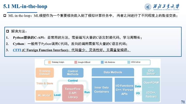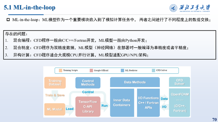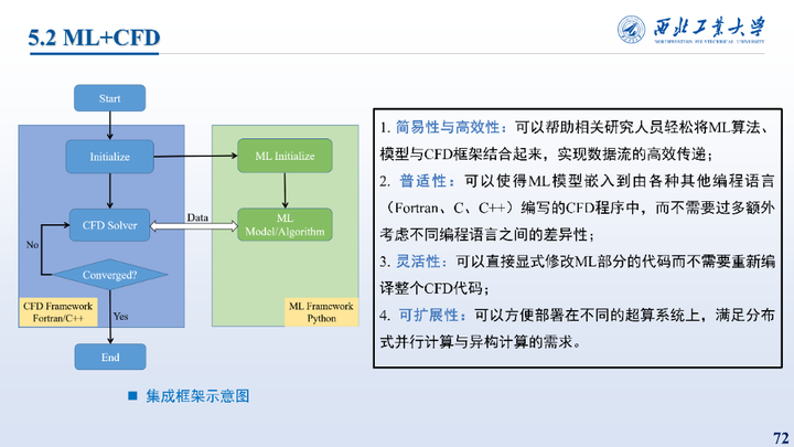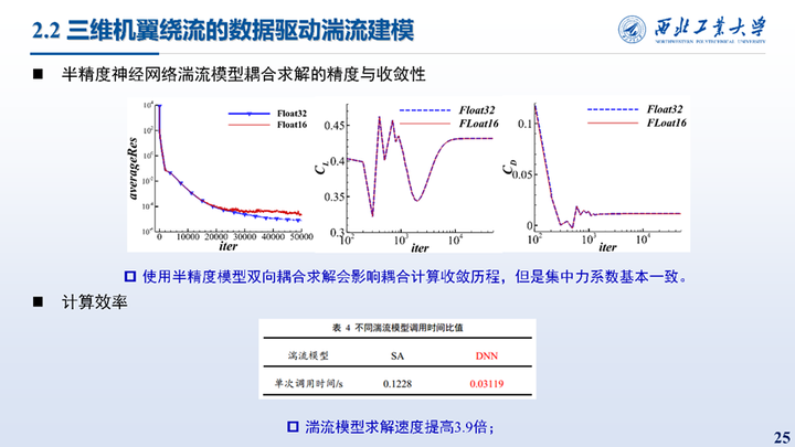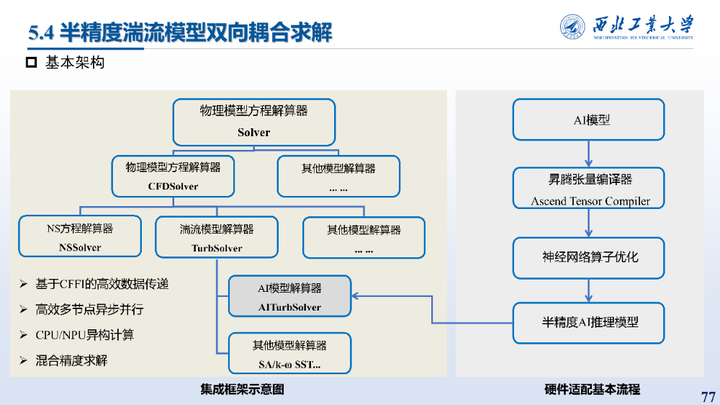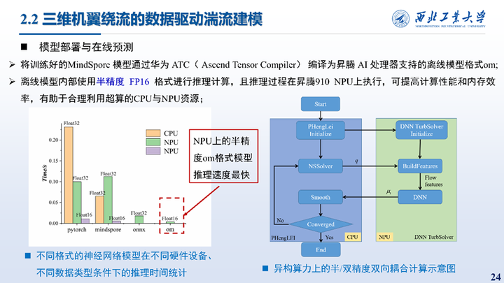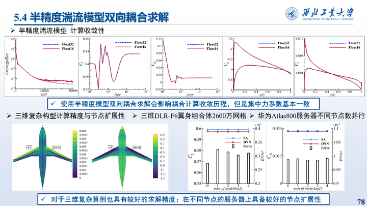 (4)针对数据驱动模型与CFD程序集成困难的问题,设计开发了一种高效通用的模型集成框架并进一步拓展了其应用范围。基于混合编程方法与动态链接库设计,实现了数据驱动模型与CFD程序之间的高效数据传递,确保了模型在基于Fortran、C++等不同语言开发的CFD程序上的无缝集成和高效运行。框架支持CPU与NPU协同计算及半精度与双精度混合计算,并通过大规模并行计算验证了其高效性和可扩展性,为机器学习算法嵌入CFD程序提供了通用技术方案。