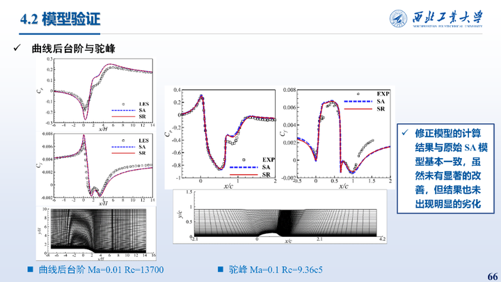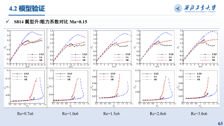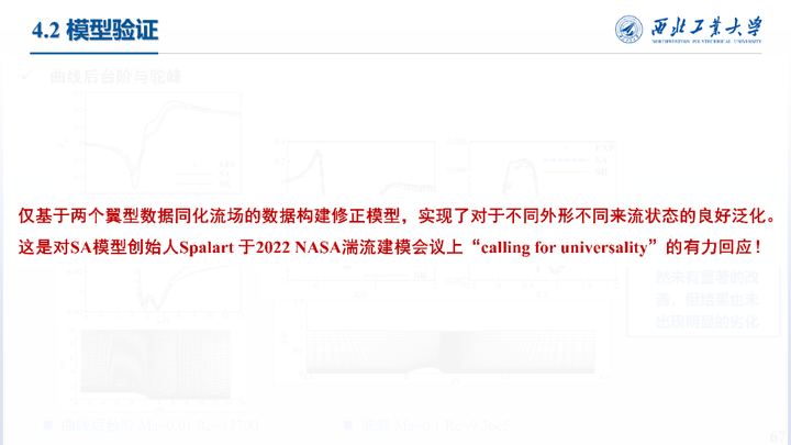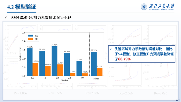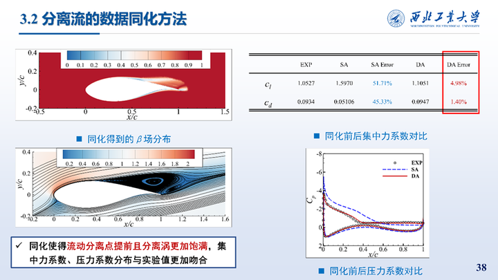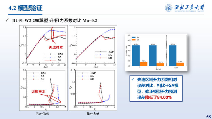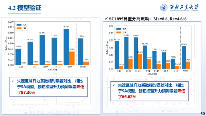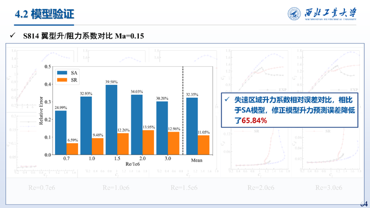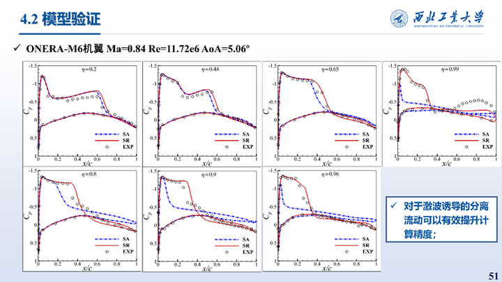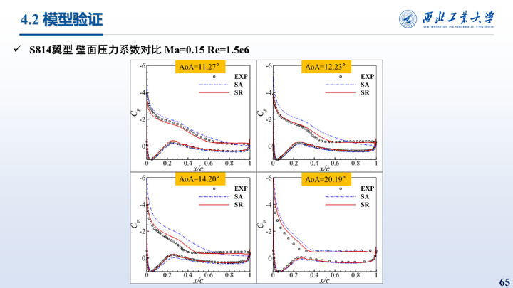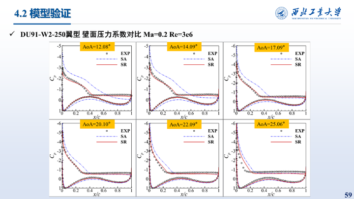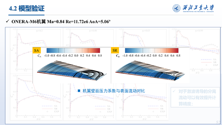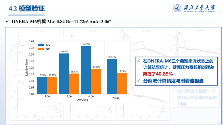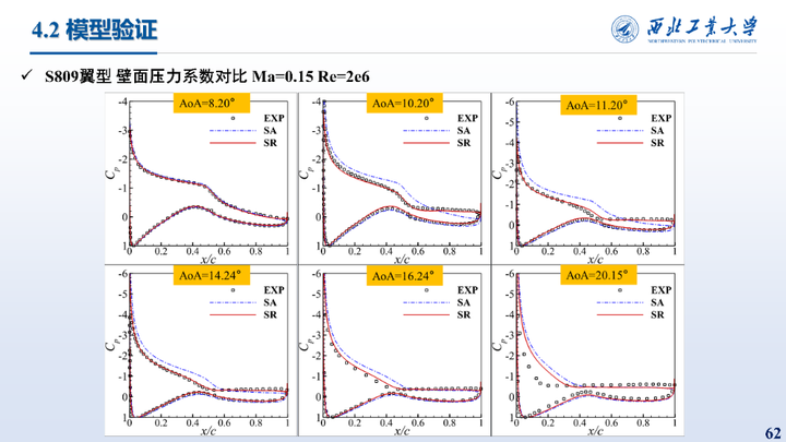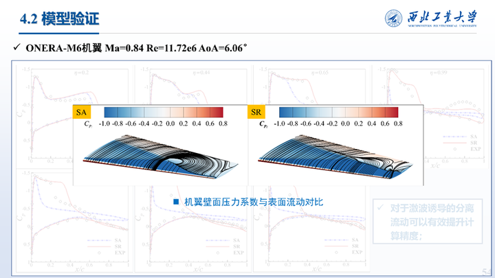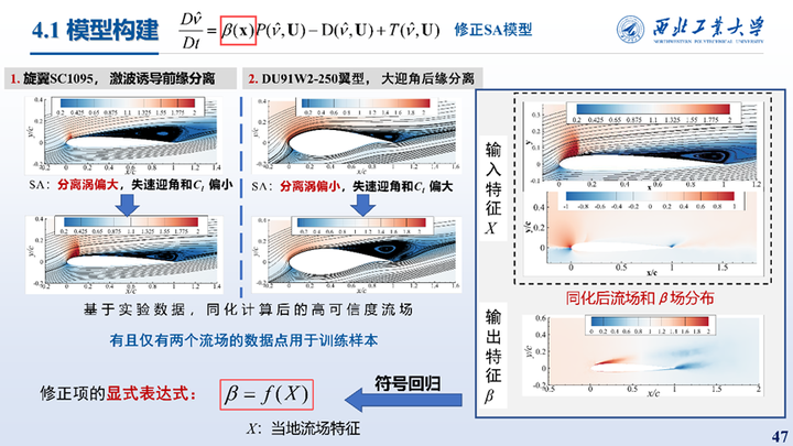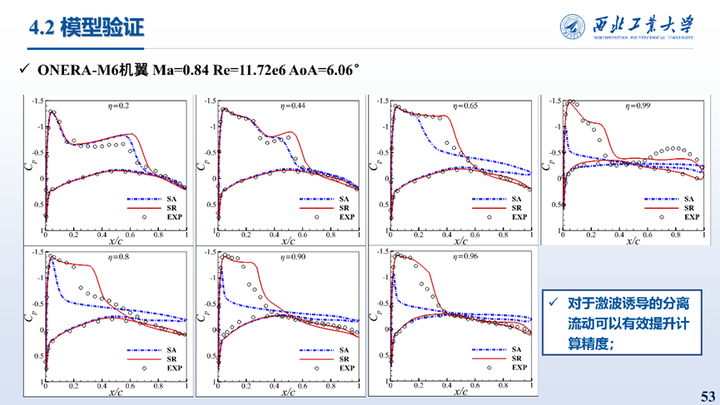 (3)针对SA湍流模型在高雷诺数复杂分离流动中模拟精度不足的局限性,提出了一种基于符号回归的湍流模型生成项修正方法。以SC1095和DU91-W2-250翼型典型失速状态下的同化数据为训练样本,采用符号回归方法构建了湍流生成项修正表达式。修正模型能够在壁面附近进行合理地修正,在形式上确保生成项系数非负且对远场无影响。在多个外形、工况上的计算结果表明该模型可以有效提升对分离流动的模拟精度,与标准SA模型相比,对翼型失速迎角下的升力预测平均相对误差降低了50%以上,并具备较强的泛化能力,适用于多种翼型及三维机翼的复杂流动模拟,同时在附着流上与经典模型保持一致。
