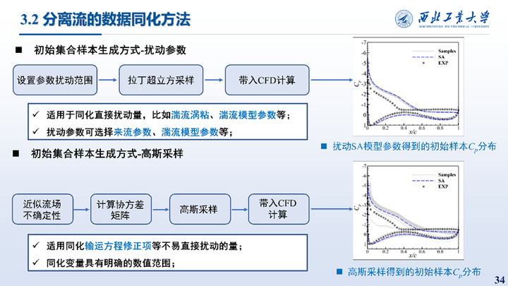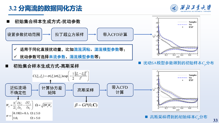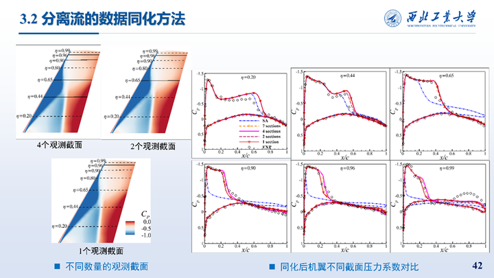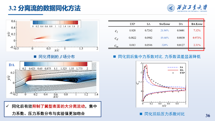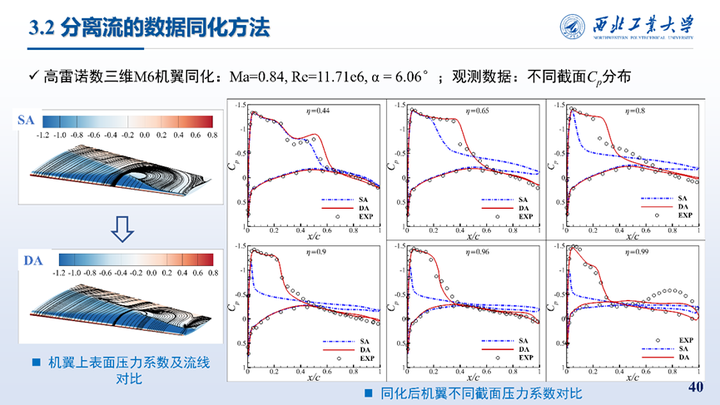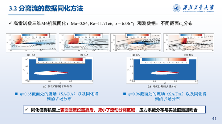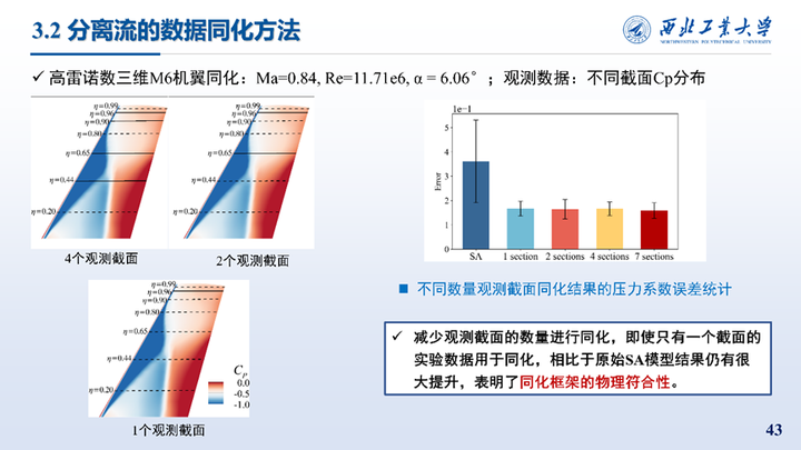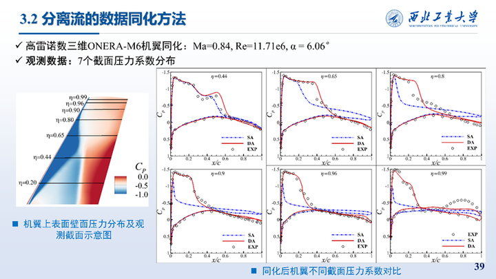 (2)针对高雷诺数分离流动中高可信度流场数据稀缺的问题,提出了一种基于集合卡尔曼滤波(Ensemble Kalman Filter, EnKF)的高效湍流场数据同化方法。以稀疏实验数据为观测数据,实现了对SA湍流模型参数和涡粘分布的有效同化,并在此基础上提出了使用EnKF对SA模型生成项空间分布场进行数据同化的方法,拓展了EnKF在湍流同化问题上的应用场景。在SC1095旋翼翼型、DU91-W2-250风力机翼型及ONERA-M6机翼的典型分离流动场景下对比验证了该方法的有效性。结果显示,通过调控局部湍流生成项,能够使得模拟结果更接近实验值,相较传统同化方法,不仅提高了同化精度,还确保了计算稳定性,为分离流动的数据驱动湍流建模研究奠定了高质量数据基础。