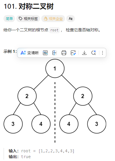 - 一棵二叉树是对称的,当且仅当它的左子树和右子树互为镜像。