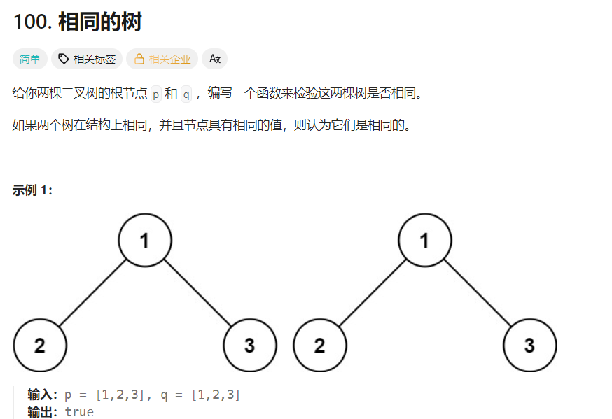 这个方法通过递归比较两棵二叉树的结构和节点值来判断是否相同,其核心思路如下: