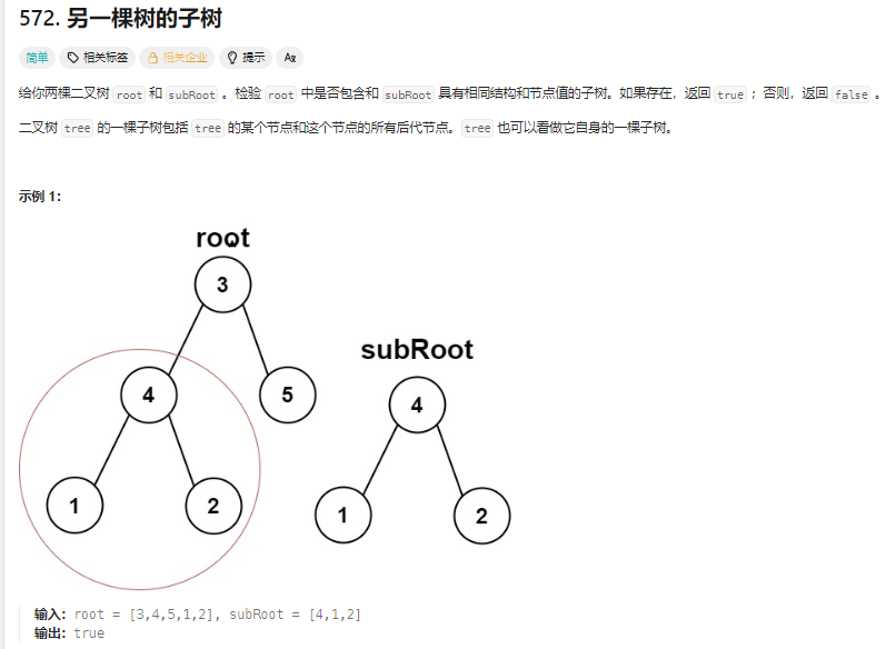 root的节点值与subroot的根节点值相同,并且issameTree(root, subroot)返回true,则说明找到匹配的子树,返回true。- 否则,递归检查
