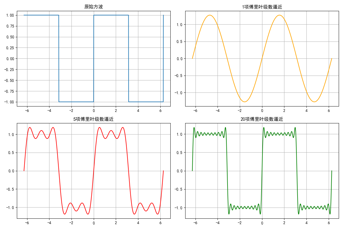 - 20 项逼近:几乎与原始方波重合,验证了 "傅里叶级数可逼近周期函数"。