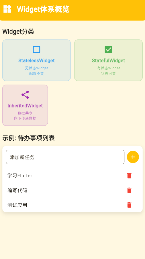 - 响应式编程:数据变化触发Widget重建,自动更新UI
