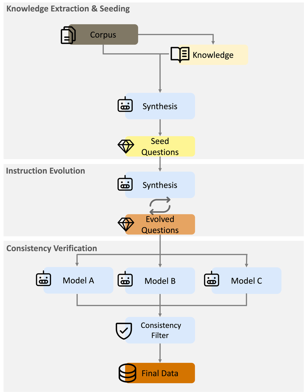 指令进化 :为提升难度和广度,采用多轮指令进化来优化问题一致性验证:利用先进的模型(例如 DeepSeek-R1 [guo2025deepseek]、Ernie-4.5 [ernie2025technicalreport])针对同一个合成问题,利用多个模型生成多个回答,然后应用语义一致性过滤器来剔除那些回答中关键信息相互矛盾的问答对
