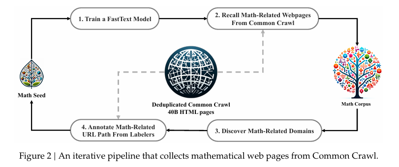 训练FastText模型->从Common Crawl中召回数学相关的网页->使用数学规则库标记并发现带有数学相关Pattern的数据->训练FastText模型(效果提升)-> 召回数据 -> ...