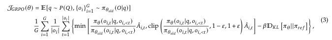 对同一个prompt进行k次模型生成得到k条response, 每条response每个token收到的奖励信号是ri,t = pi_theta/pi_ref, 序列级别的奖励被广播到了句子的每一个token上, 计算每个response的组内优势𝐴𝑖,𝑡,𝐴𝑖,𝑡 在该序列内部对所有token也是一样的