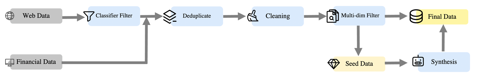 金融数据召回:对于web数据,通过一个bert分类出金融相关书籍(和deepseekmath中的FastText作用相同),合并专有财务数据去重复,清洗多维度过滤,得到种子数据和最终的数据