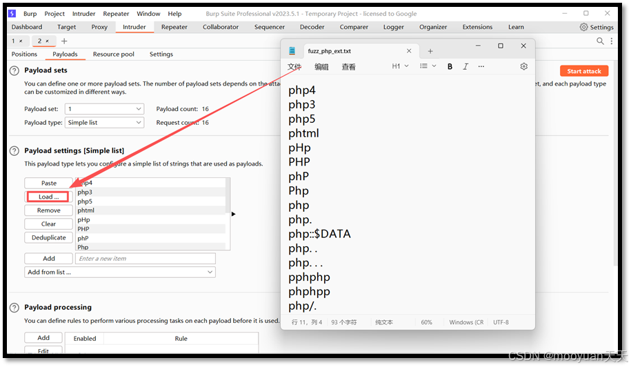 构造php后缀的绕过字典,包括如php3、php4、phtml、以及大小写绕过的pHP、PHP、Php、pHp等等,对第一个payload使用这个字典进行配置,具体如下所示。